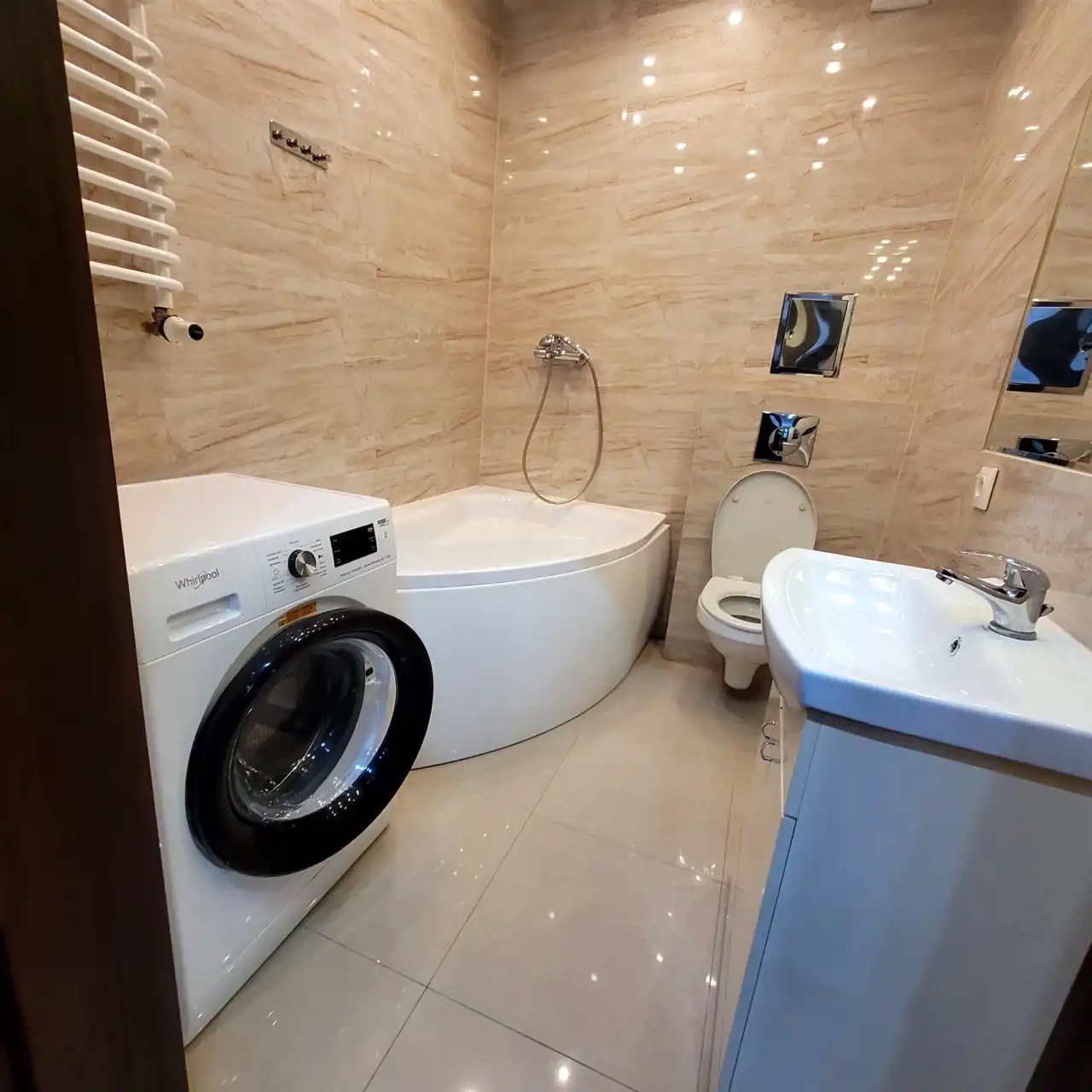 Mieszkanie wyposażone w sprzęt AGD - brak zmywarki. W łazience wanna.