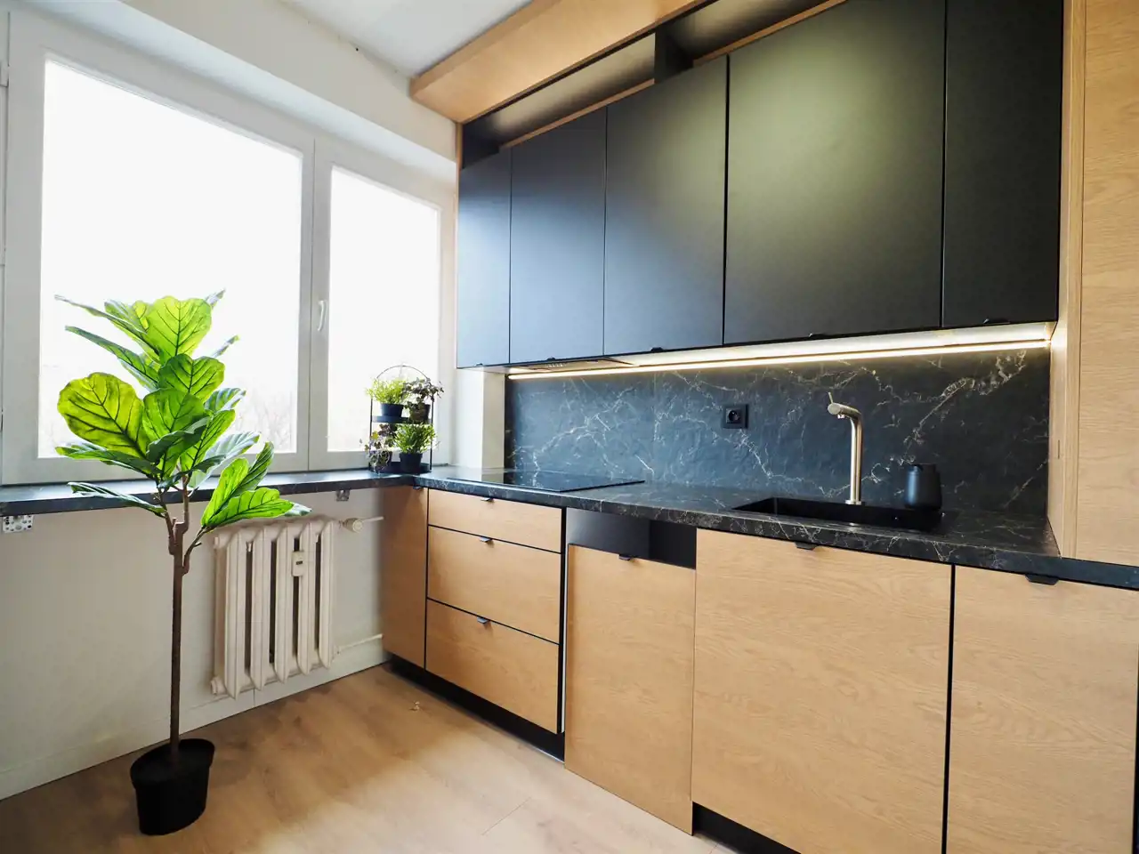 W kuchni zabudowa kuchenna nowoczesna pod wymiar z oświetleniem LED. W zabudowie - piekarnik, płyta indukcyjna oraz pochłaniacz. Do dokupienia w gestii Kupującego lodówka pod zabudowę i zmywarka. Mamy tutaj także witrynę z przydymionym szkłem oraz oświetleniem.