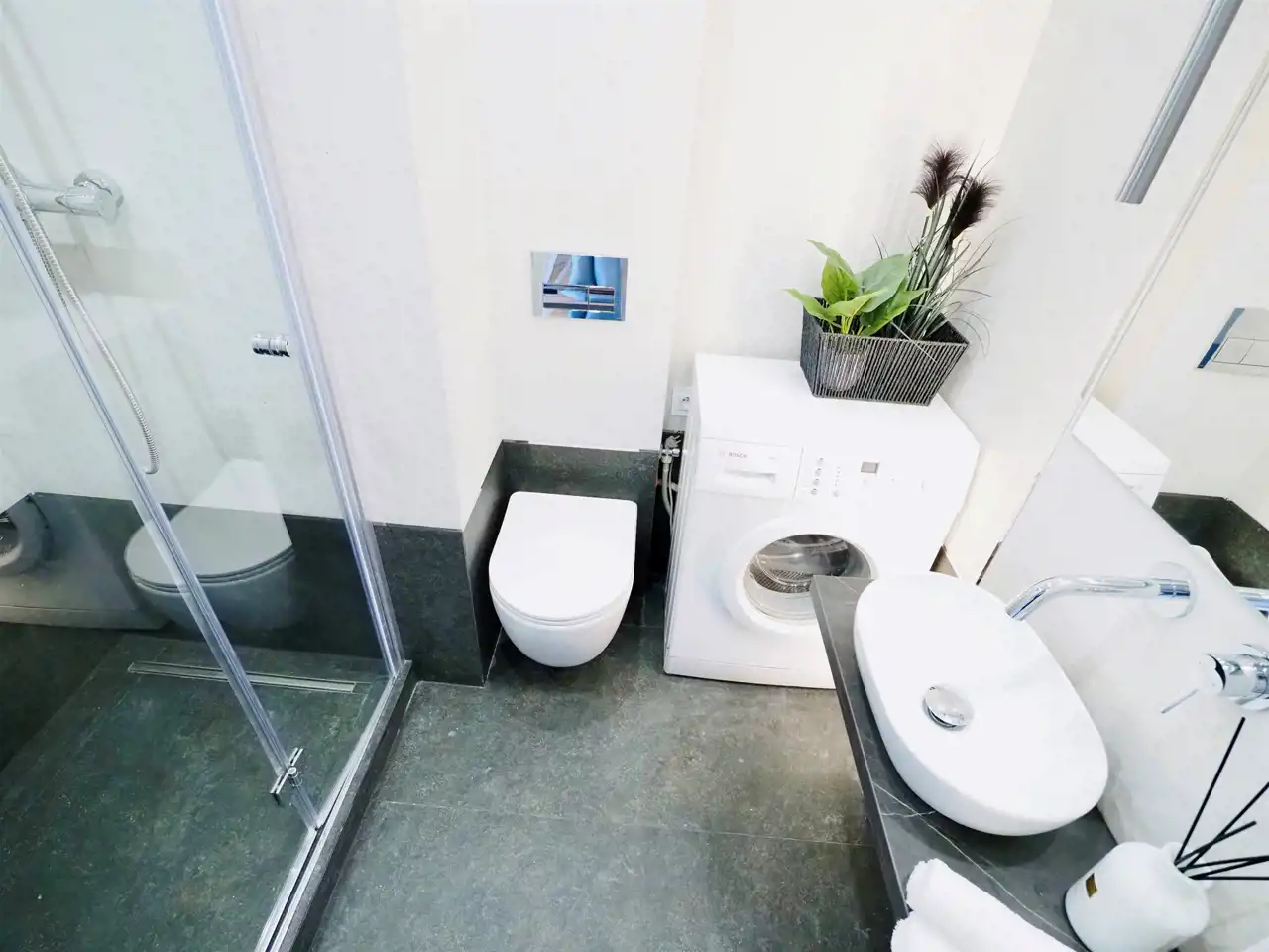 W łazience prysznic typu walk - in, płytki wysokiej jakości.