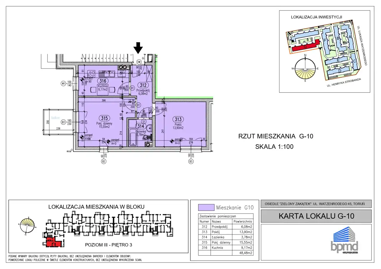 Prezentowany lokal mieszkalny o symbolu G-10, w klatce schodowej bez windy, na III piętrze budynku, o powierzchni 48,49 m2, składa się z :