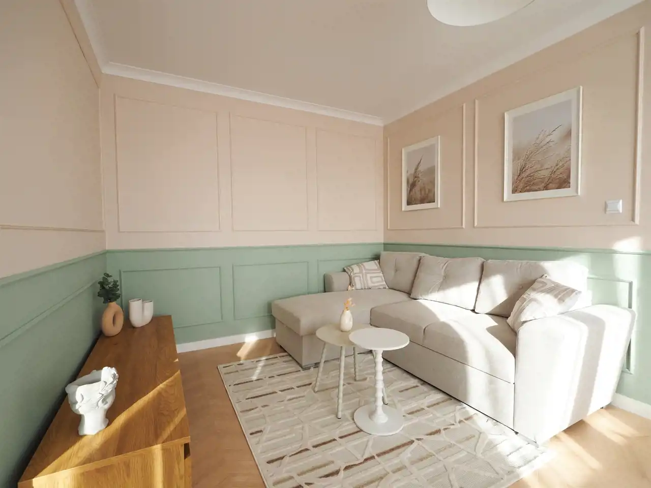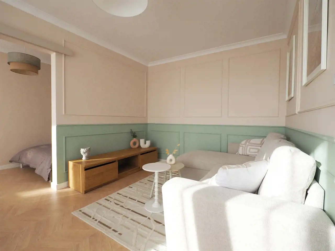 Na podłogach przepiękne panele - jodełka - położone na wyrównanej podłodze, na ścianach gładzie - sztukateria.