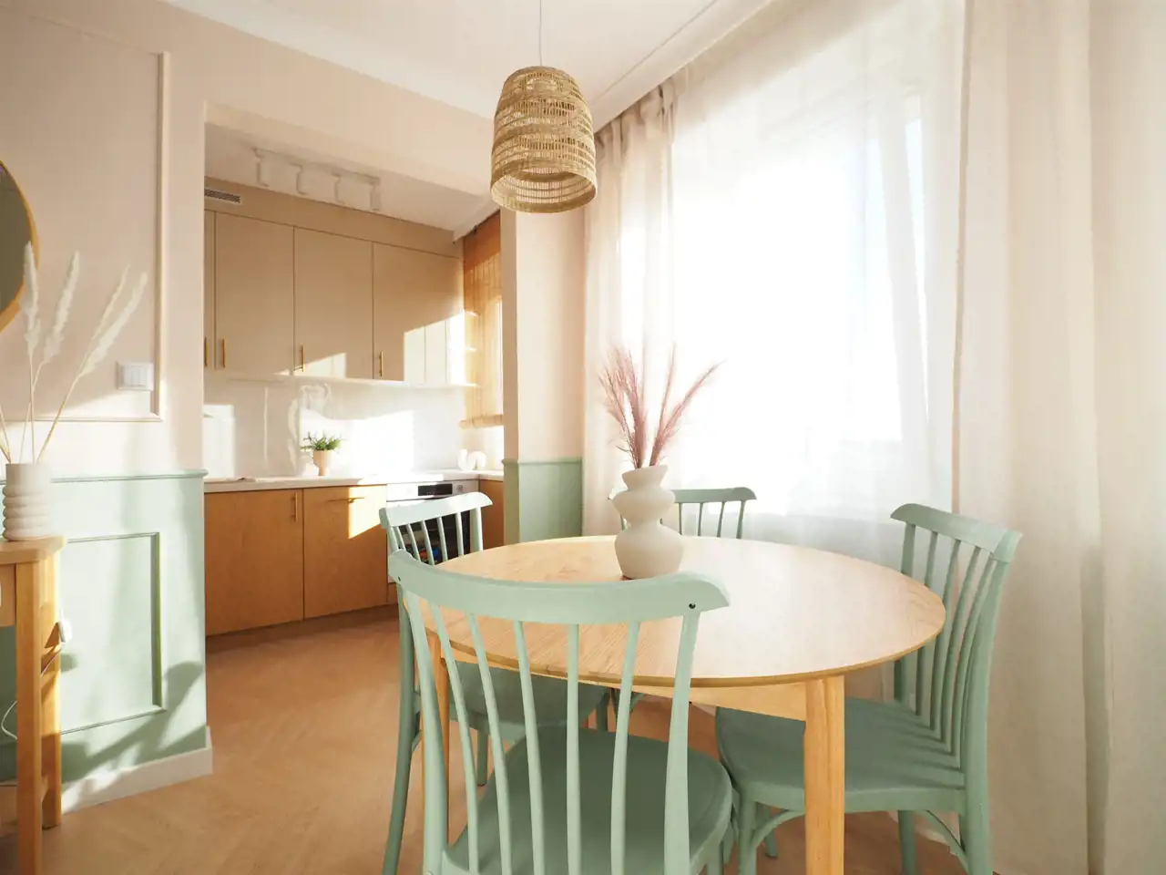 W salonie piękne meble - stolik kawowy, sofa rozkładana oraz szafka RTV. W jadalni stół z czterema krzesłami.