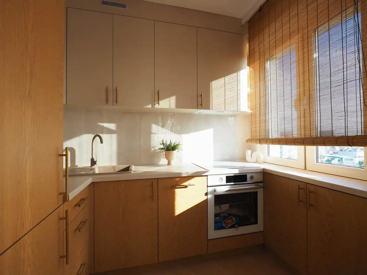 Kuchnia półotwarta z zabudową kuchenną zrobioną pod wymiar przez stolarza - w kuchni mnóstwo szafek, lodówka - przewidziana w zabudowę. Sprzęt AGD - pochłaniacz, płyta indukcyjna biała, piekarnik.