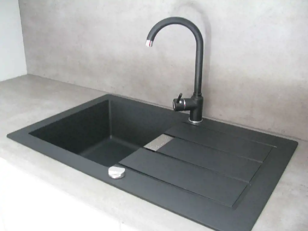 Kuchnia umeblowana białą lakierowaną zabudową z czarnym granitowym zlewem i baterią, nowy sprzęt AGD zmywarka BOSCH w zabudowie,płyta indukcyjna, piekarnik z funkcją mikrofali, nowoczesny pochłaniacz, lodówka z zamrażarką 180 cm wysokości w zabudowie.