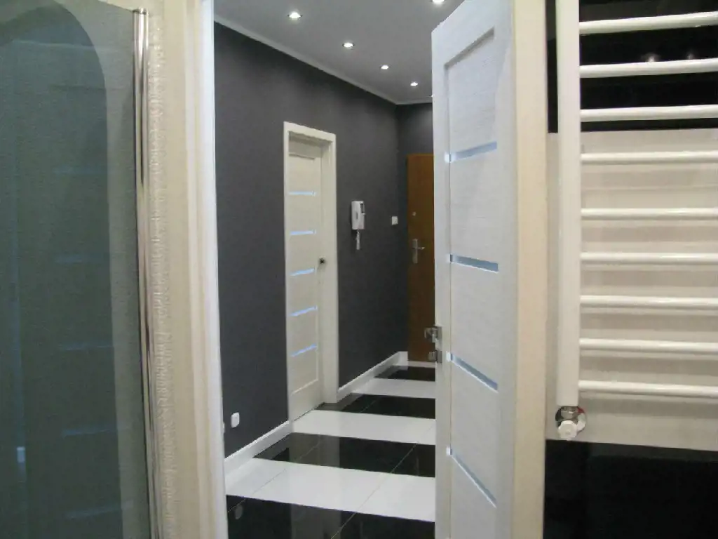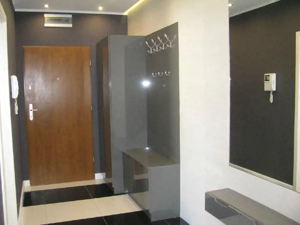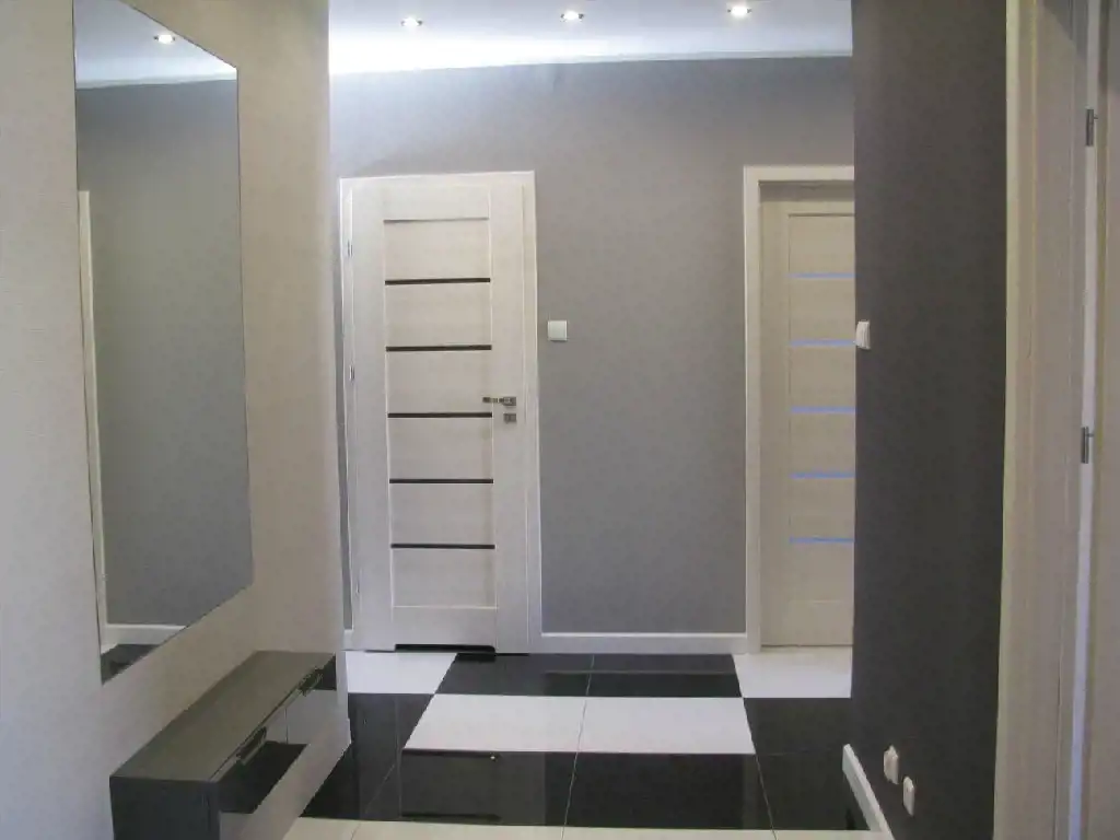 Nowoczesna aranżacja mieszkania na ścianach gładzie, na podłogach w pokojach panele natomiast w przedpokoju i kuchni gres polerowany, w przedpokoju lakierowana zabudowa na ścianie gres hiszpański duże lustro,sufit podwieszany oświetlenie ledowe .
