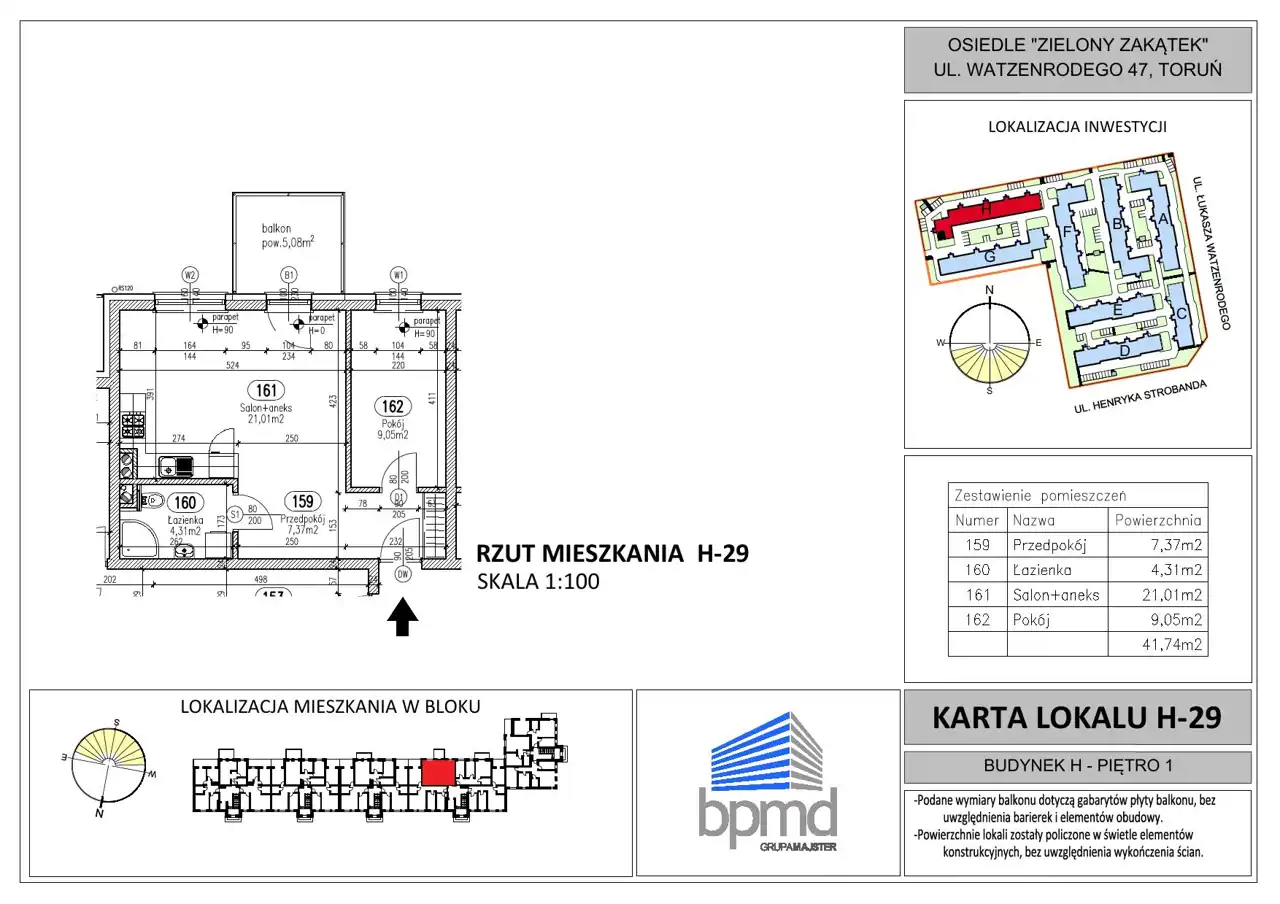 Prezentowany lokal mieszkalny o symbolu H-29, w klatce schodowej z windą, na I piętrze budynku, o powierzchni 41,74 m2, składa się z :