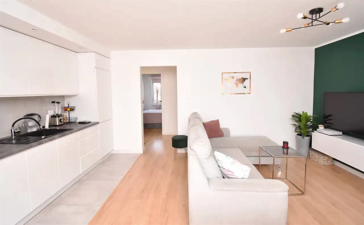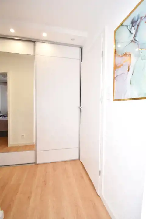 Mieszkanie utrzymane jest w jasnych, neutralnych kolorach, urządzonych z dbałością o detale w nowoczesnym i eleganckim stylu.