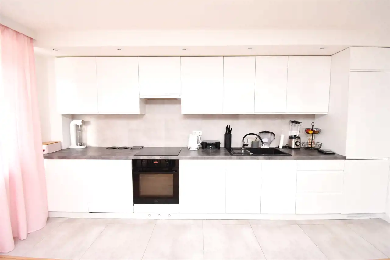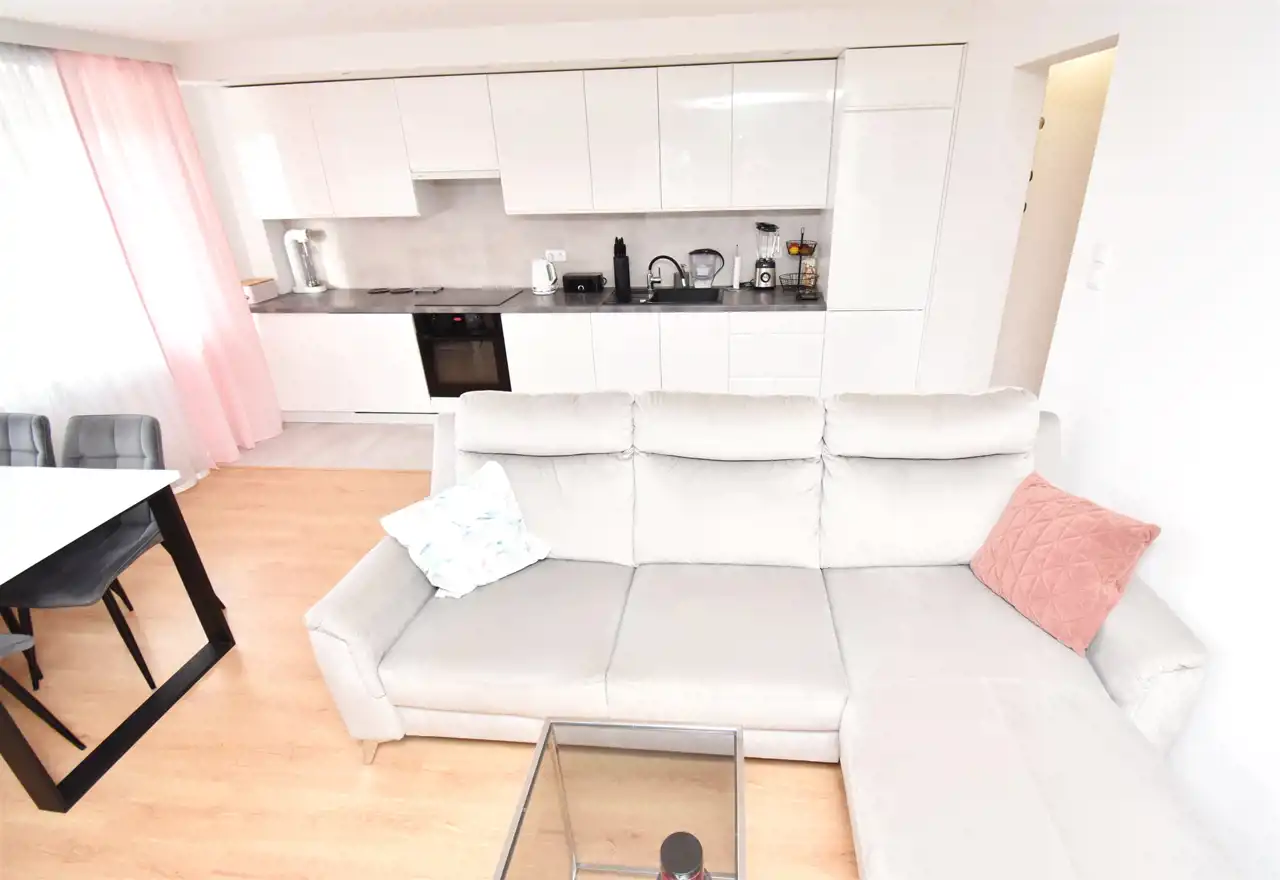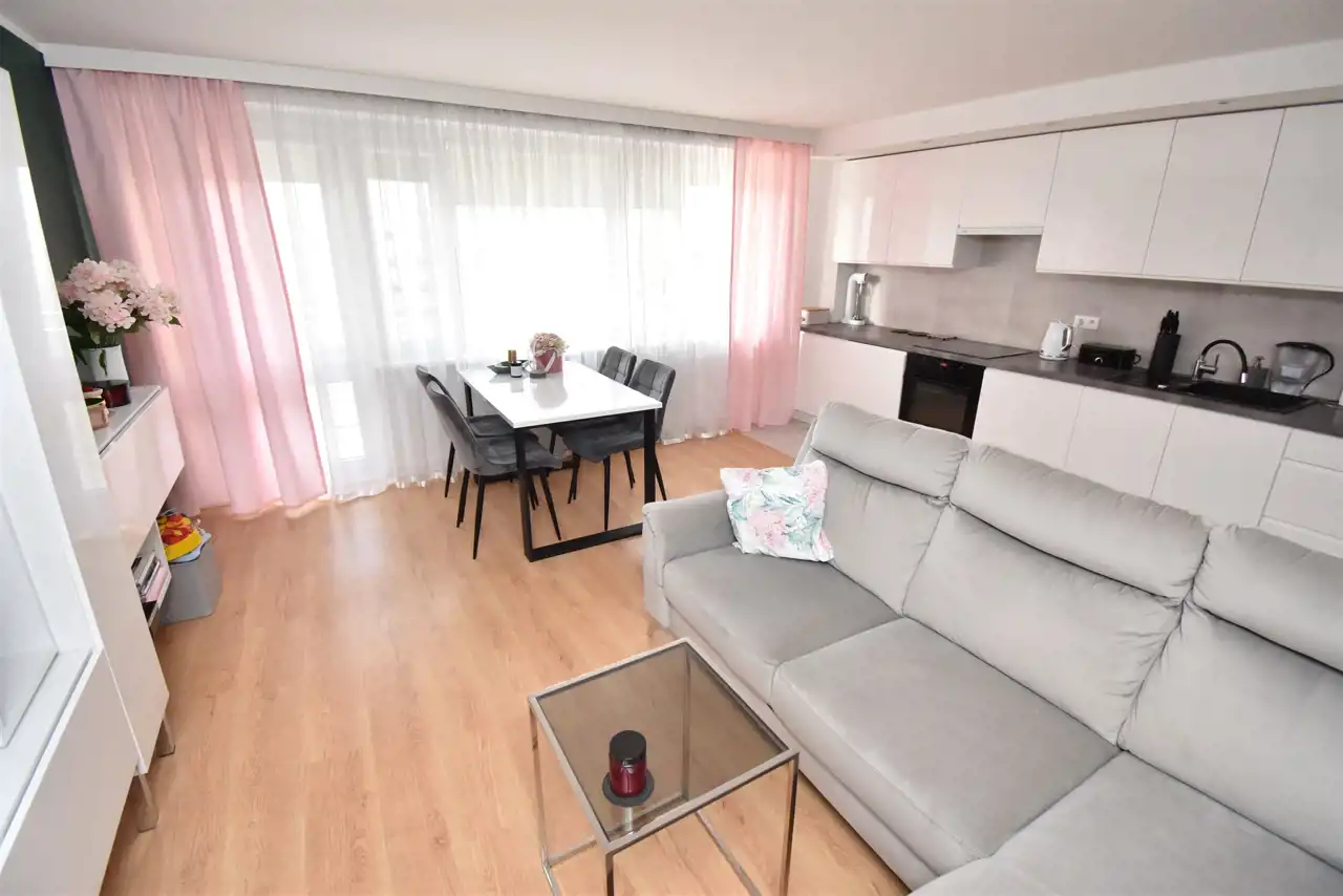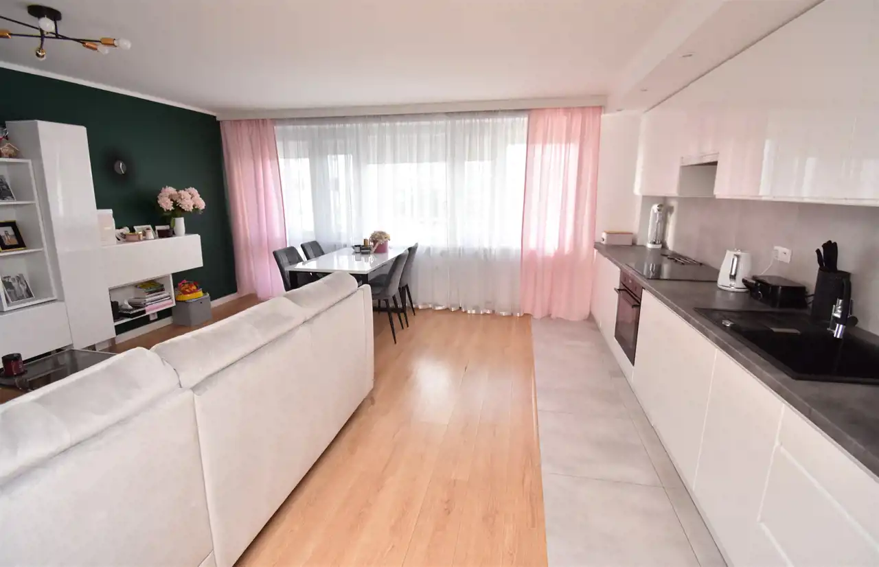 Nowoczesna, jasna przestrzeń z wyjściem na dużą loggię, idealną na chwilę relaksu o zachodzie słońca.