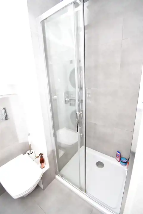 Łazienka z WC – funkcjonalna i utrzymana w stonowanej stylistyce, z prysznicem, na wyposażeniu pozostaje pralka,