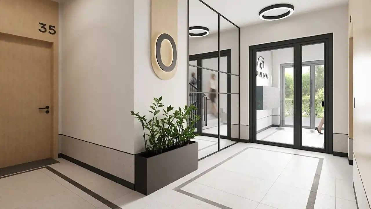 Wnętrza części wspólnych Lumeny zaprojektowano z myślą o ponadczasowej estetyce i codziennym komforcie mieszkańców. Jasna kolorystyka, naturalne materiały oraz starannie dobrane detale tworzą elegancką, a jednocześnie przyjazną przestrzeń.
