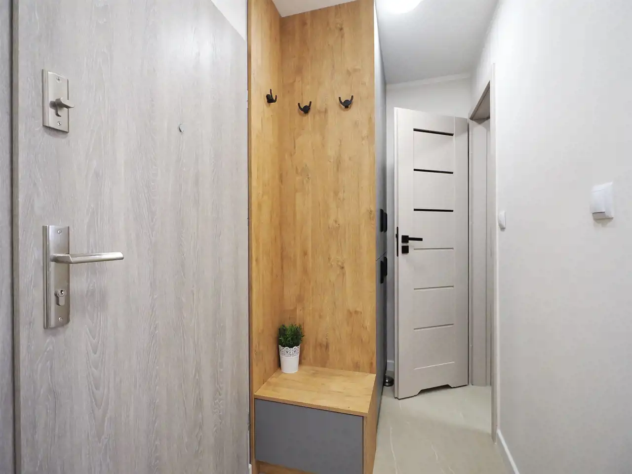 W przedpokoju szafa w zabudowie - a w niej pralka i dużo miejsca na inne drobiazgi.