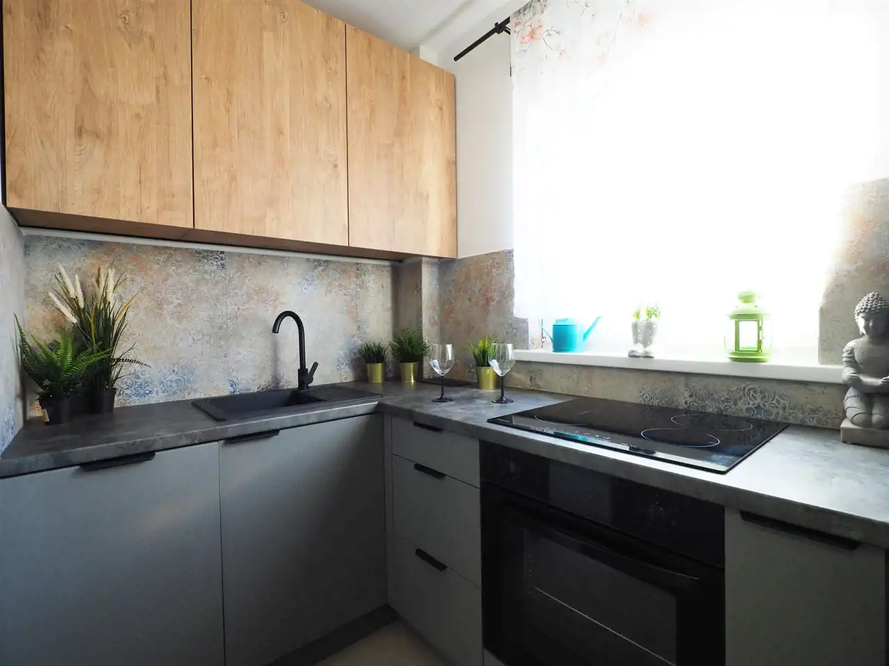 W kuchni zabudowa kuchenna z całym sprzętem AGD - na gwarancji. Jest tutaj zmywarka, piekarnik, płyta indukcyjna oraz lodówka.