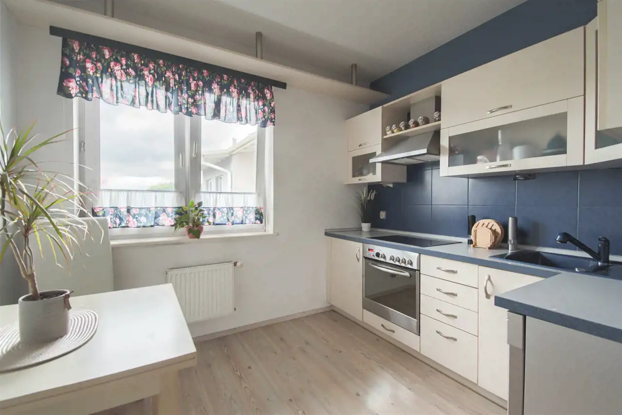Kuchnia - zabudowa kuchenna z płytą elektryczną, piekarnikiem, dużą lodówką i zmywarką, stół z krzesłami