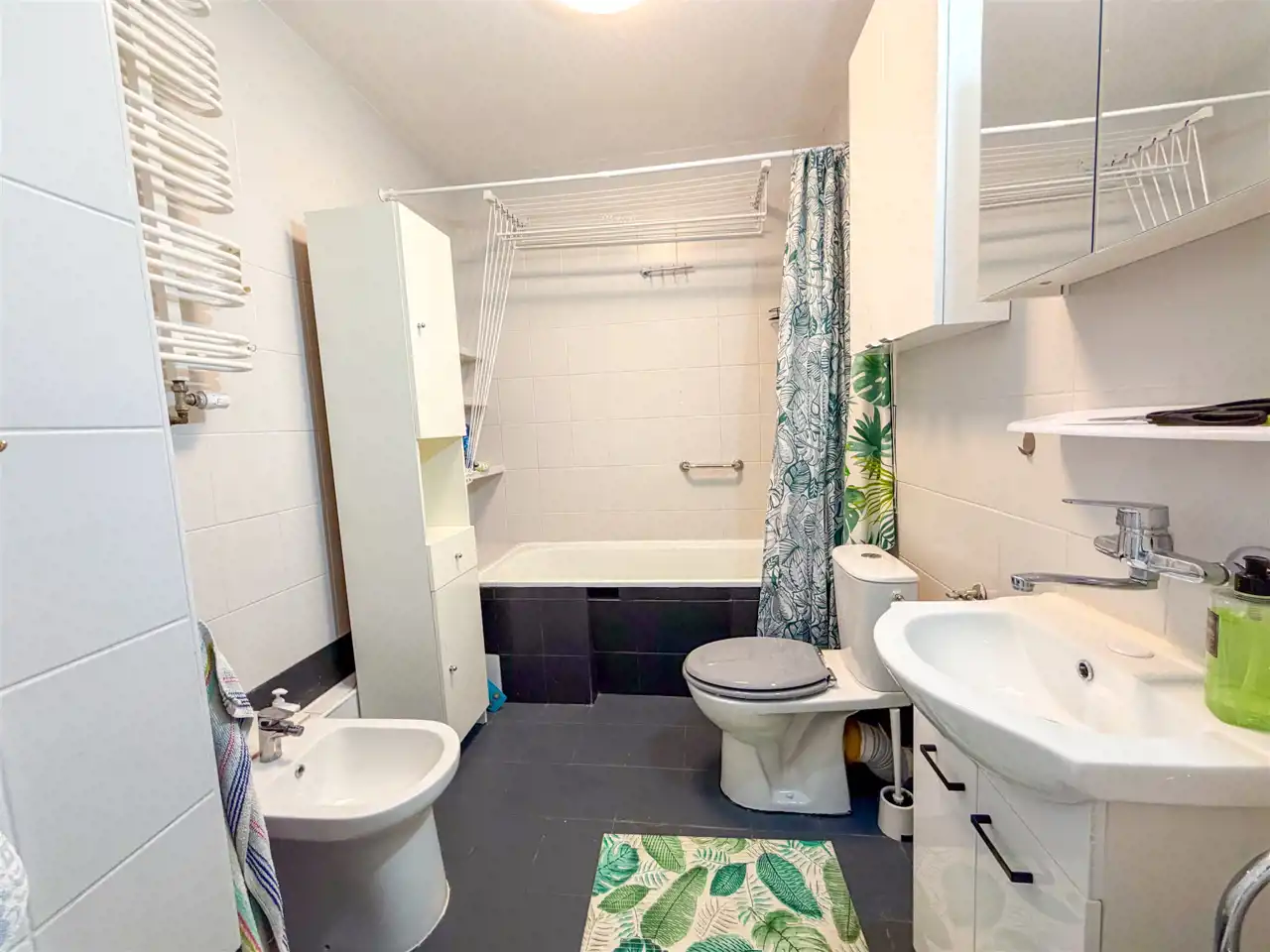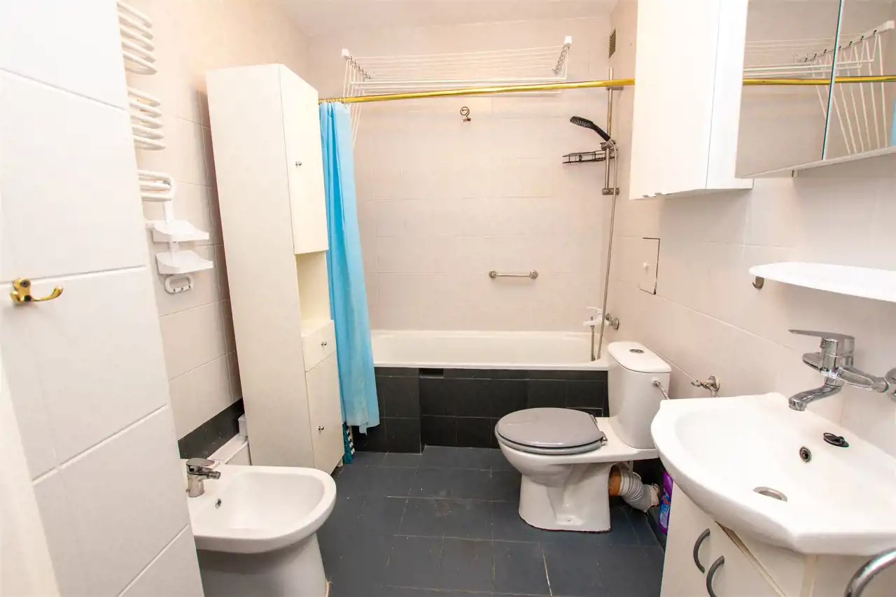 W kuchnia zabudowa kuchenna wraz ze sprzętem agd - do dyspozycji kuchenka z piekarnikiem, okap, pralka oraz lodówka. Duża łazienka połączona z wc, zainstalowano w niej wannę, wc, umywalkę oraz bidet - ponadto istnieje możliwość i miejsce przeniesienia pralki z kuchni do łazienki, a w miejsce pralki np. montażu zmywarki w kuchni.