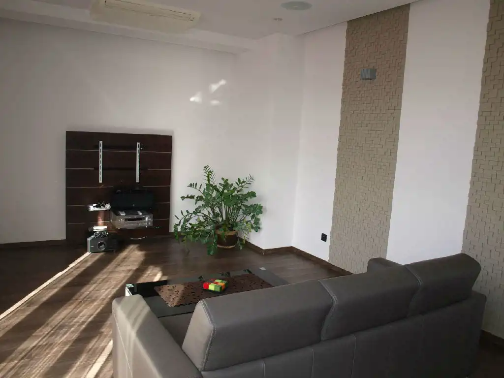 Do dyspozycji w salonie jest klimatyzacja, rzutnik Full HD, ekran 125 cali, kino domowe z głośnikami w suficie podwieszonym, skórzana kanapa rozkładana i stolik kawowy. Na ścianach kamień ozdobny podświetlany kinkietami. W części jadalnej stół z czterema krzesłami. Aneks kuchenny o powierzchni 10mkw, nowoczesne meble, kompletne AGD Siemens a w tym: zmywarka, lodówka zabudowana, piekarnik parowy, piekarnik z mikrofalówką, ciśnieniowy ekspres kawowy, płyta indukcyjna, okap.