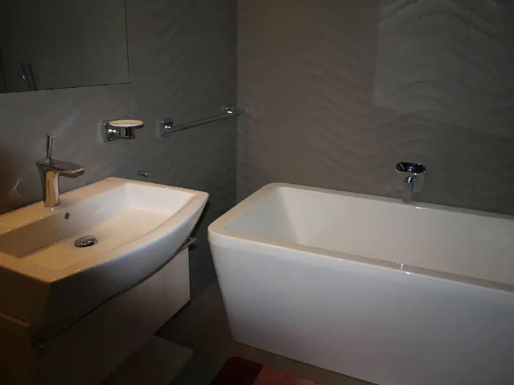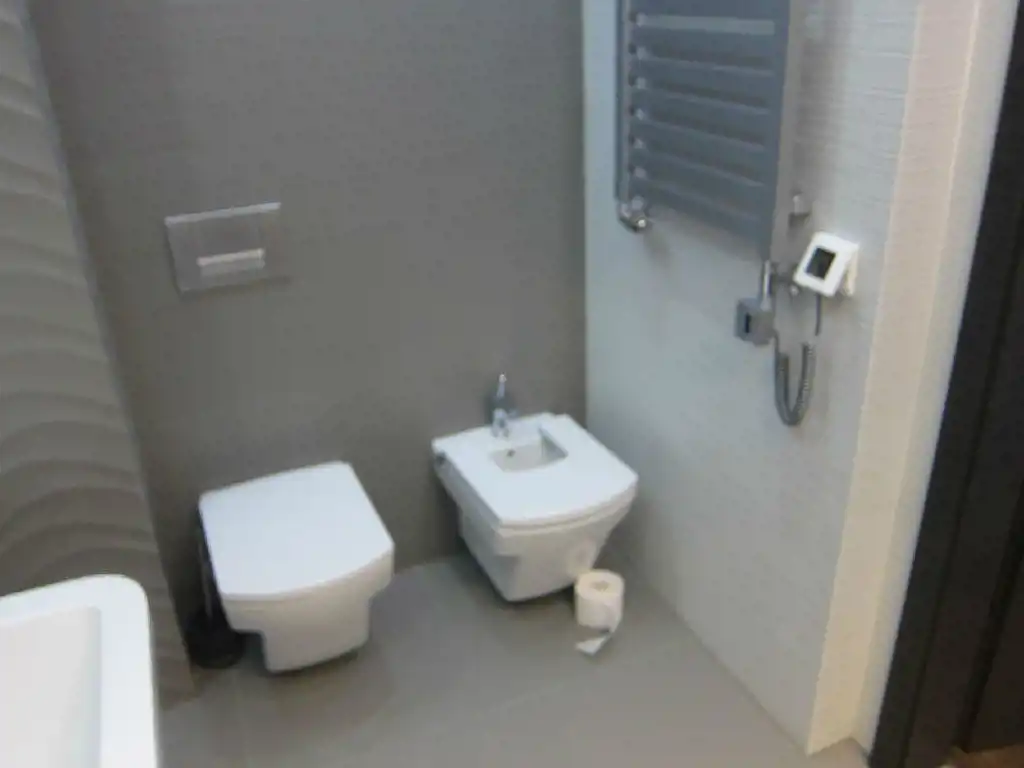 Przestronna łazienka wyposażona w muszlę klozetową i bidet z klapami wolno opadającymi, wanna napełniana z przelewu, podgrzewana podłoga, grzejnik z grzałką elektryczną. Tutaj także zamontowana jest czujka ruchu, część świateł zapala się zaraz po wejściu do łazienki.