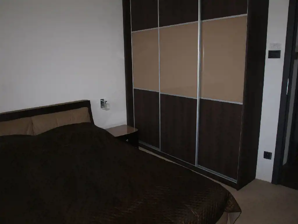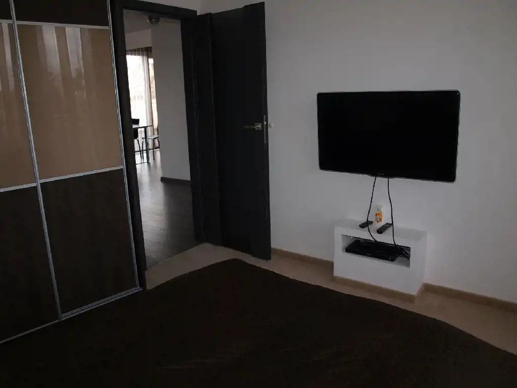 Sypialnia z dużym łóżkiem, dwoma szafkami nocnymi, szafą garderobianą oraz telewizorem LCD Philips. Druga sypialnia nie jest wyposażona w meble.