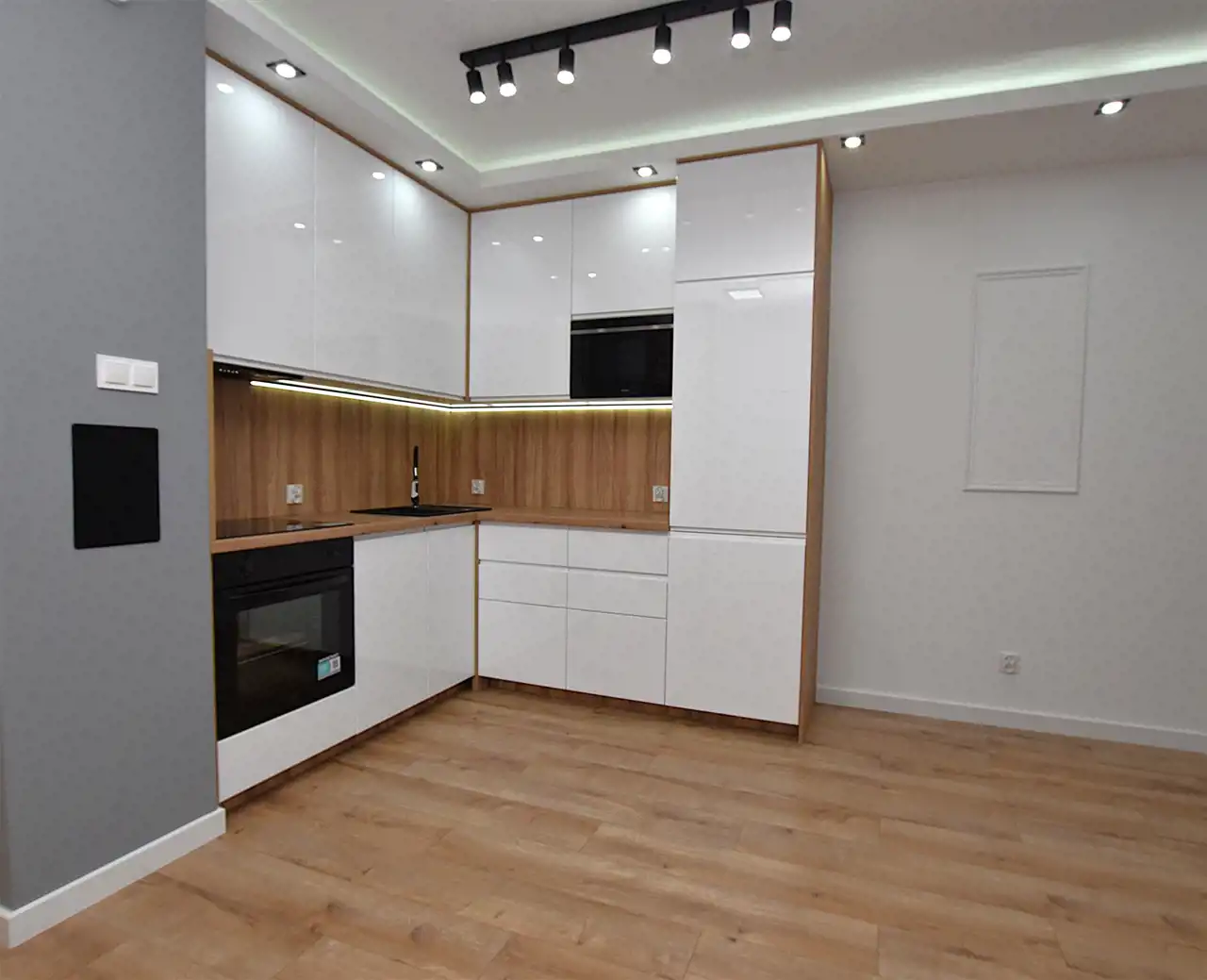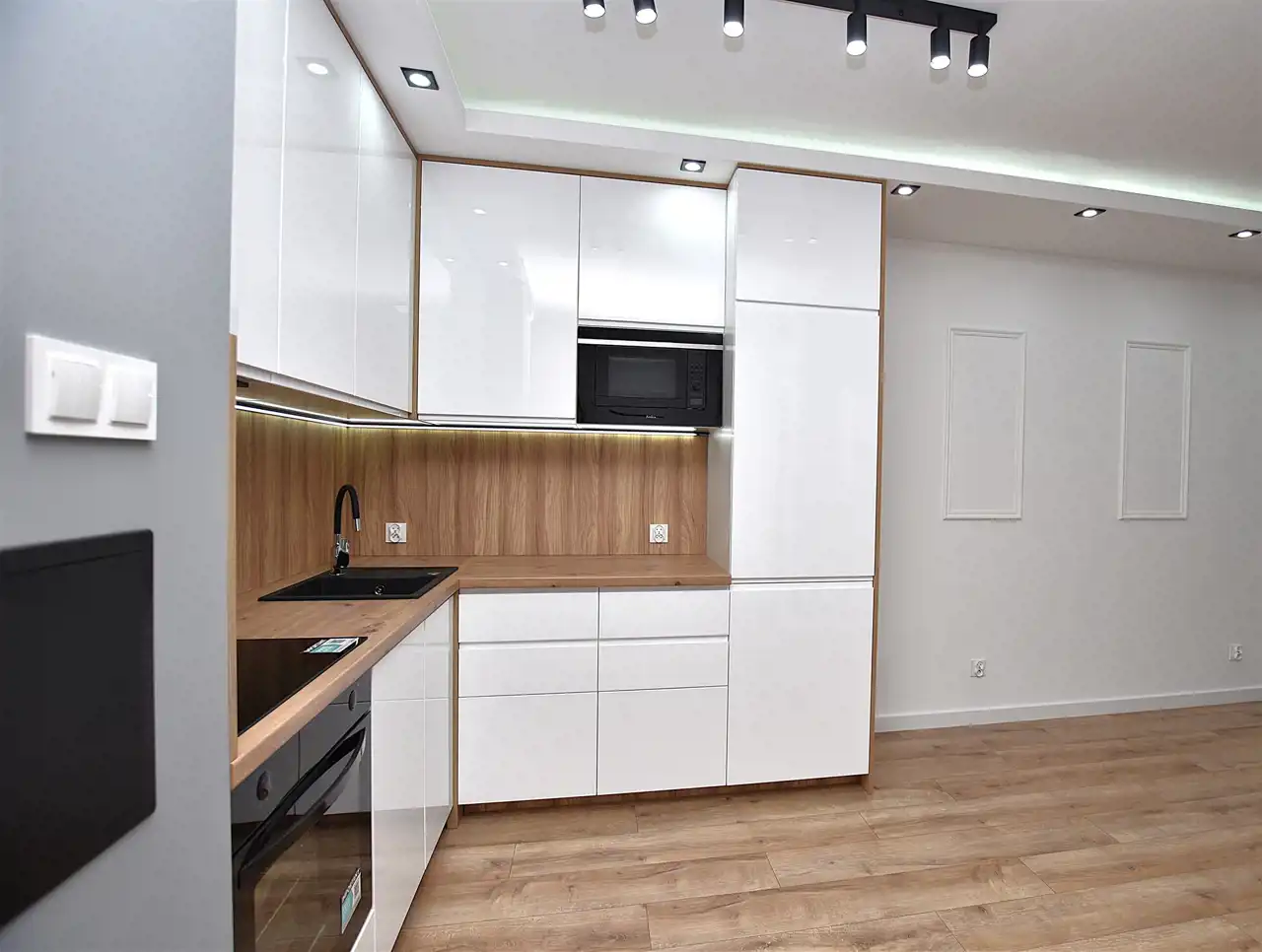 Lokal mieszkalny został GUSTOWNIE I PORZĄDNIE WYKOŃCZONY. Wszystkie użyte materiały są bardzo dobrej jakości. Na podłogach piękne panele o wysokiej klasie ścieralności, drzwi wewnętrzne firmy Porta, w kuchni szafki lakierowane na wymiar oraz wszystkie sprzęty w zabudowie: lodówka, płyta indukcyjna, piekarnik, kuchenka mikrofalowa, zmywarka, pochłaniacz. W sypialni i w przedpokoju zabudowane szafy typu komandor.