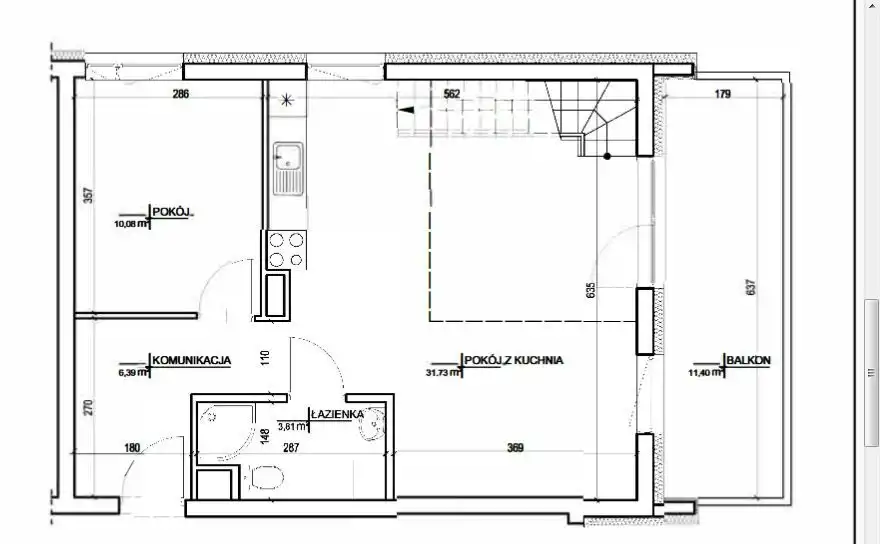 Na I poziomie (52m2) znajdują się 2 pokoje: salon z aneksem kuchennym: 31,73m2, pokój: 10,08m2 łazienka z WC: 3,81m2 oraz przedpokój: 6,39m2. Na tym poziomie znajduje się balkon o pow. 11,40 m2.