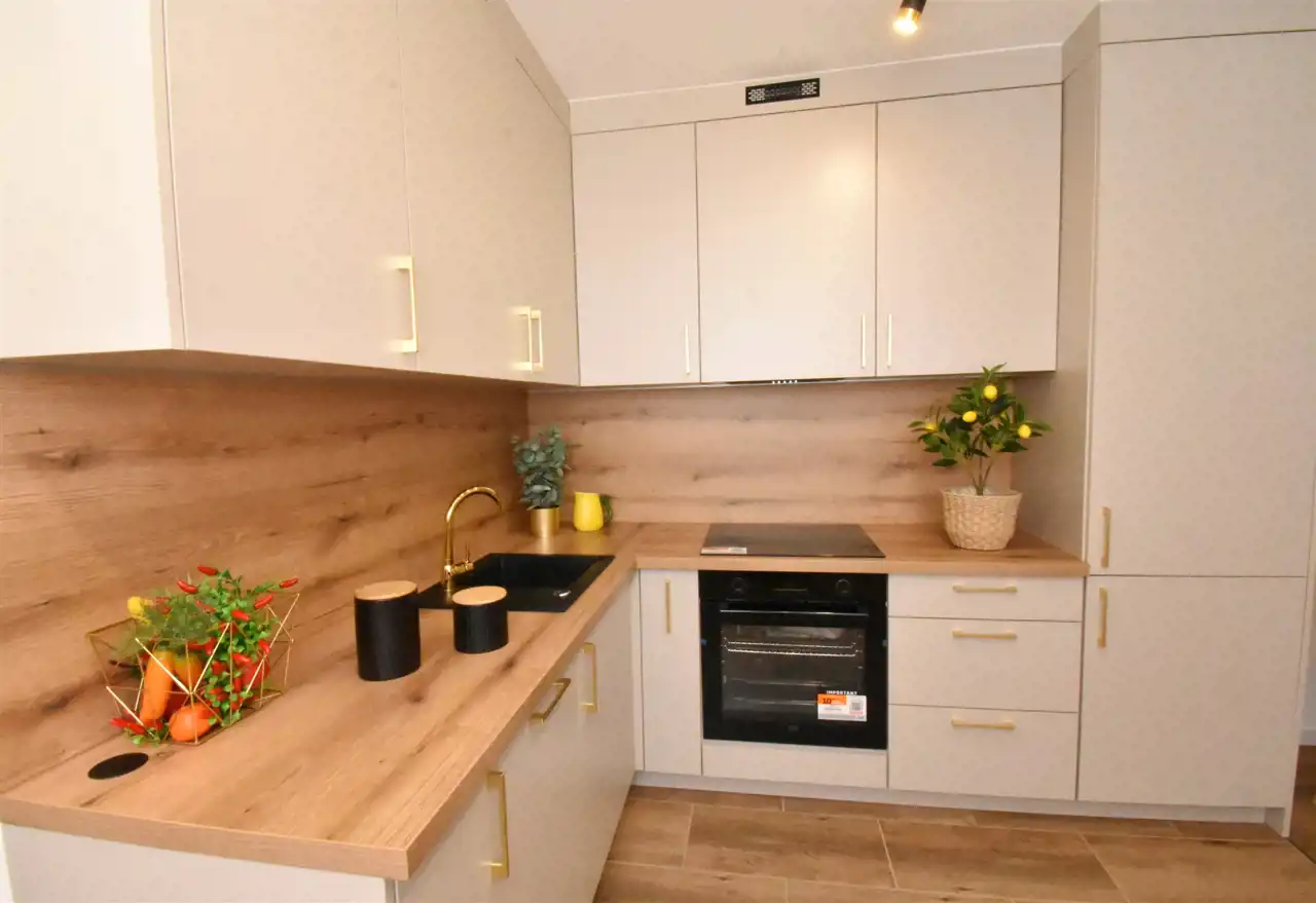 Najmodniejszy kaszmirowy kolor frontów połączony z drewnem tworzy elegancką i ponadczasową aranżację.