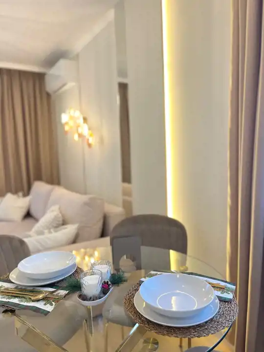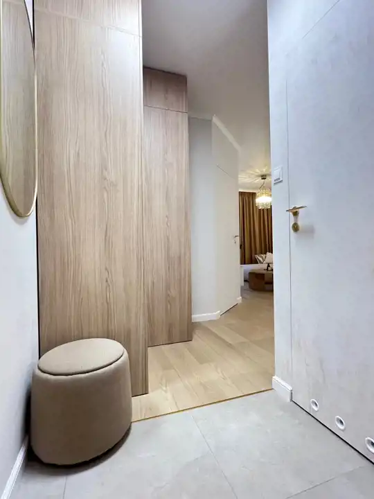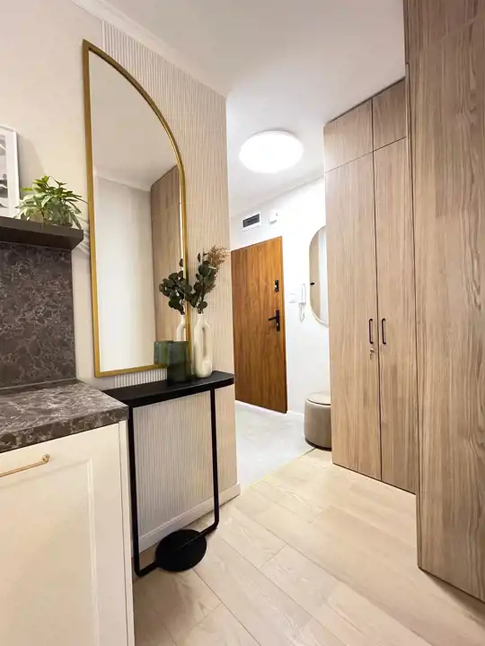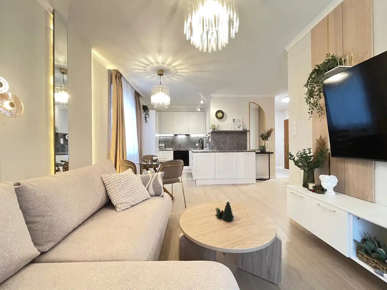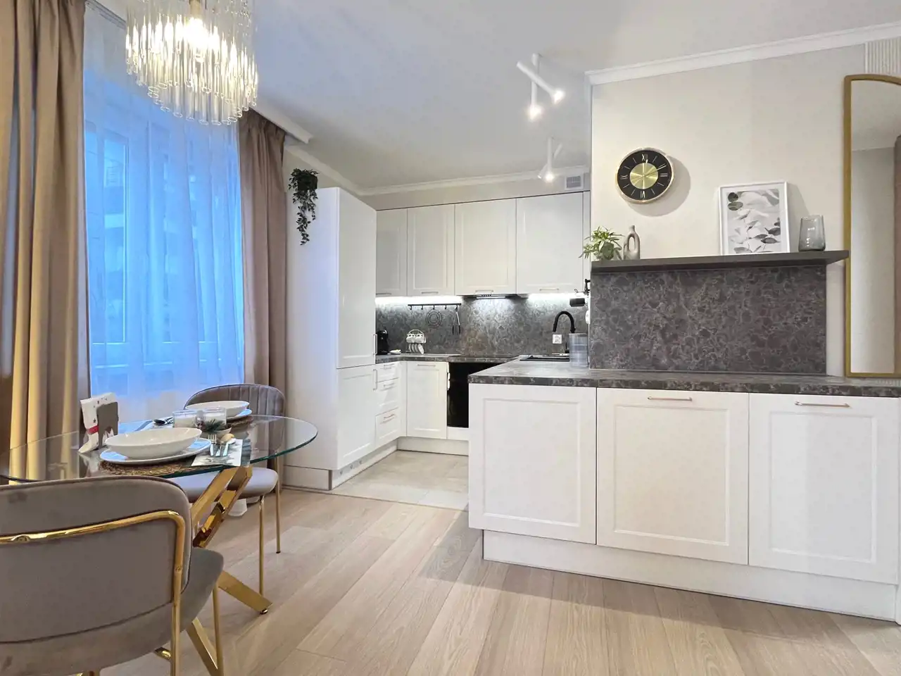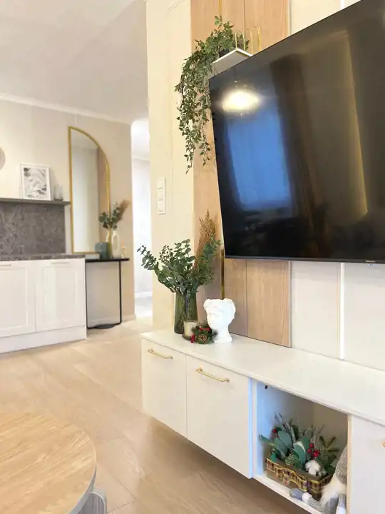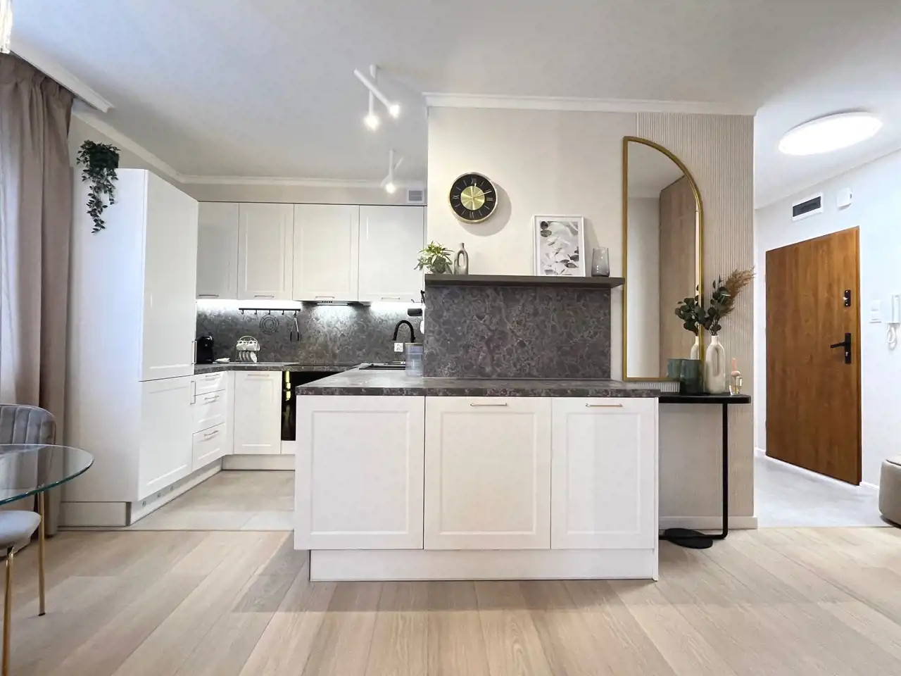 Jest świeżo wykończony, w pełni umeblowany i wyposażony w sprzęty RTV i AGD - telewizor, pralkosuszarkę, lodówkozamrażarkę, zmywarkę, piekarnik, płytę indukcyjną, okap kuchenny. Dodatkowo zainstalowano klimatyzację - zarówno z salonie jak i sypialni.