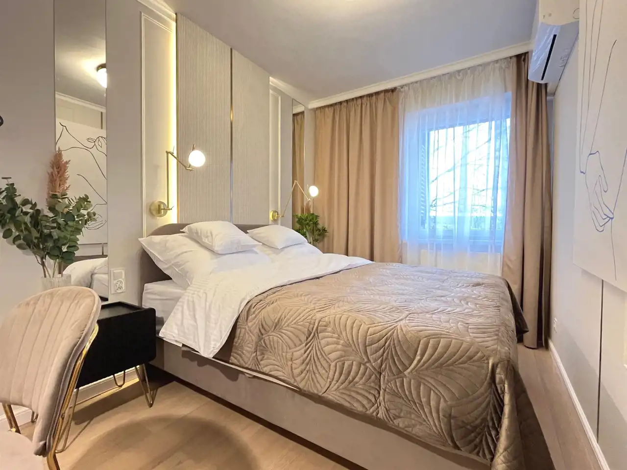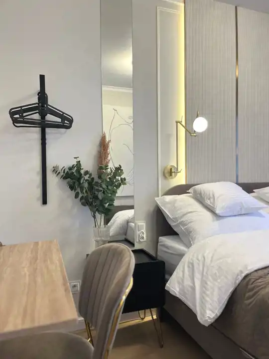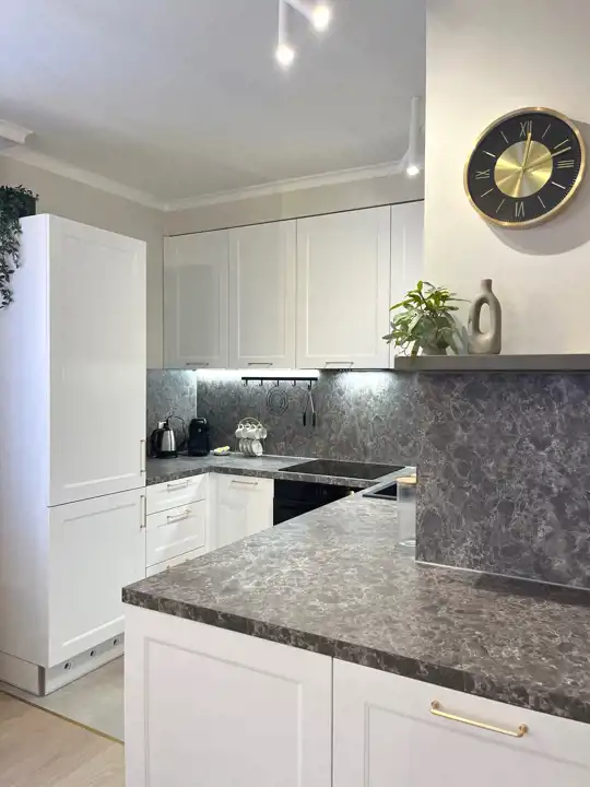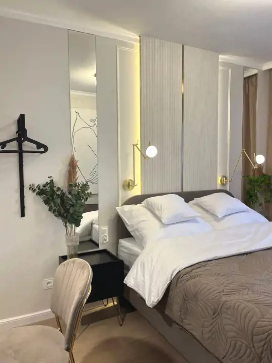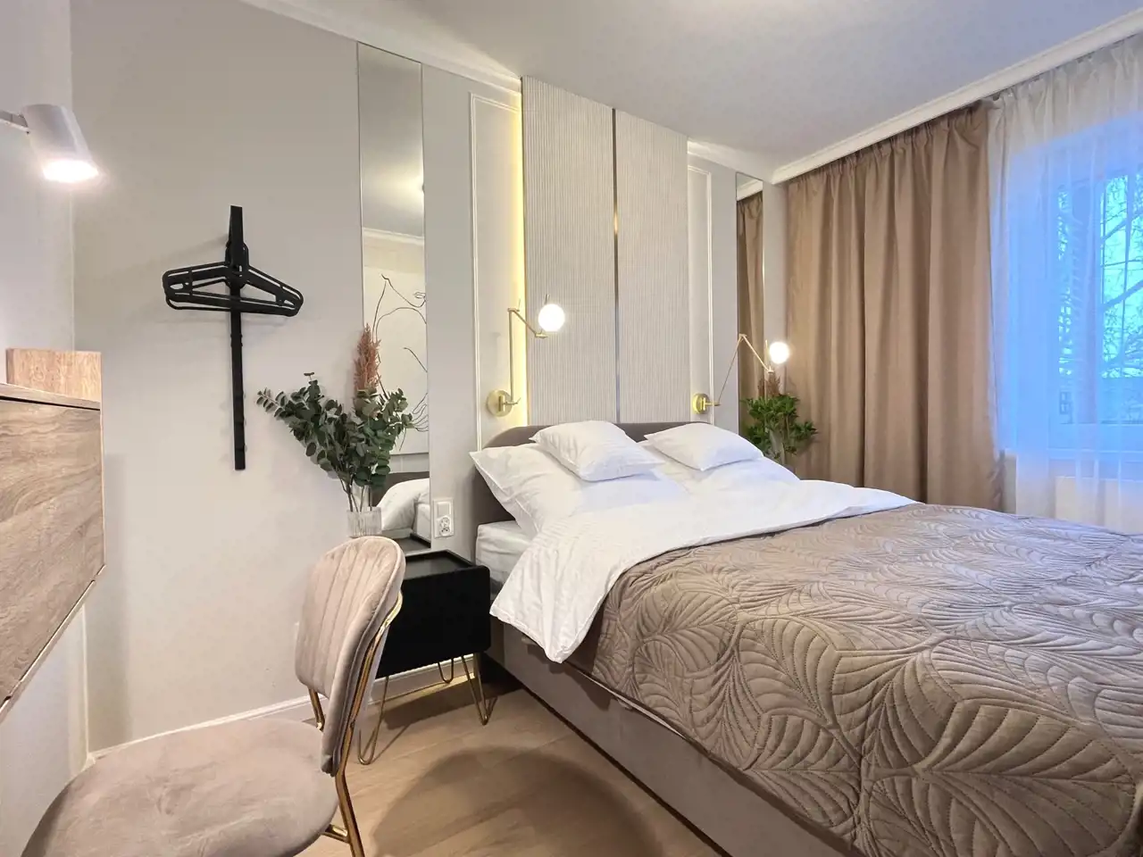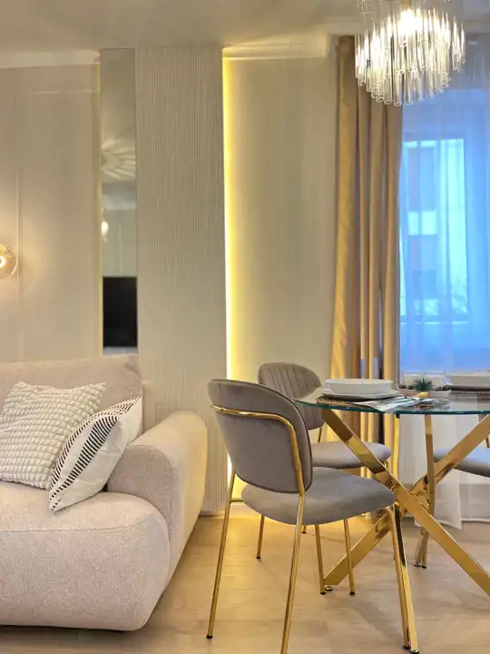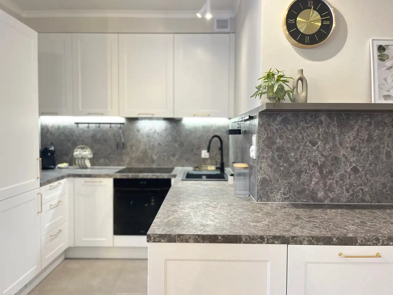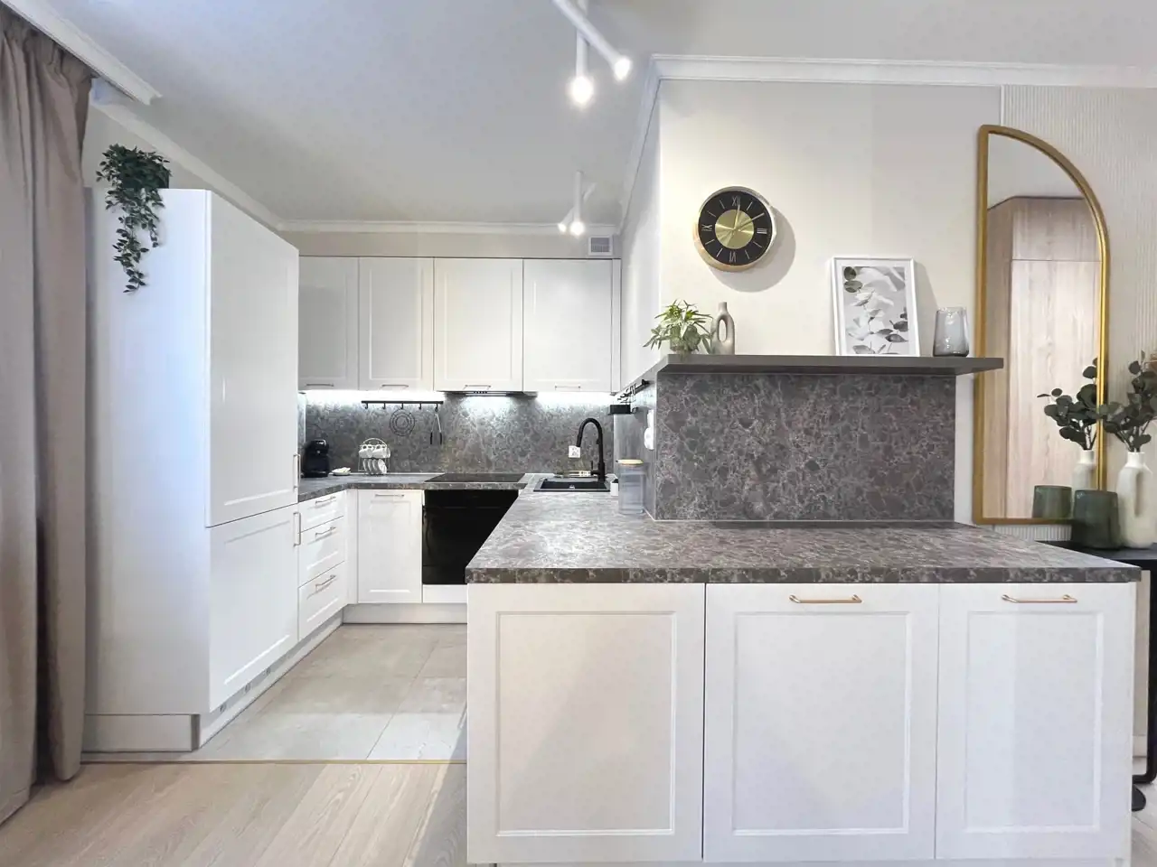 Jest świeżo wykończony, w pełni umeblowany i wyposażony w sprzęty RTV i AGD - telewizor, pralkosuszarkę, lodówkozamrażarkę, zmywarkę, piekarnik, płytę indukcyjną, okap kuchenny. Dodatkowo zainstalowano klimatyzację - zarówno z salonie jak i sypialni.