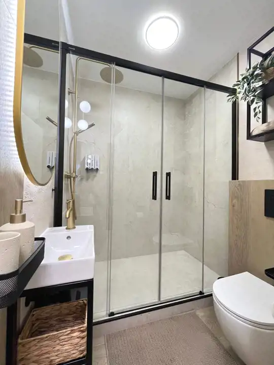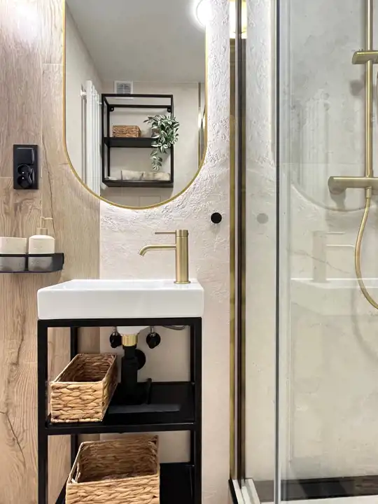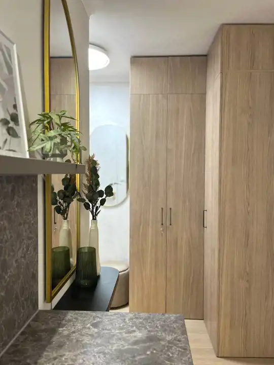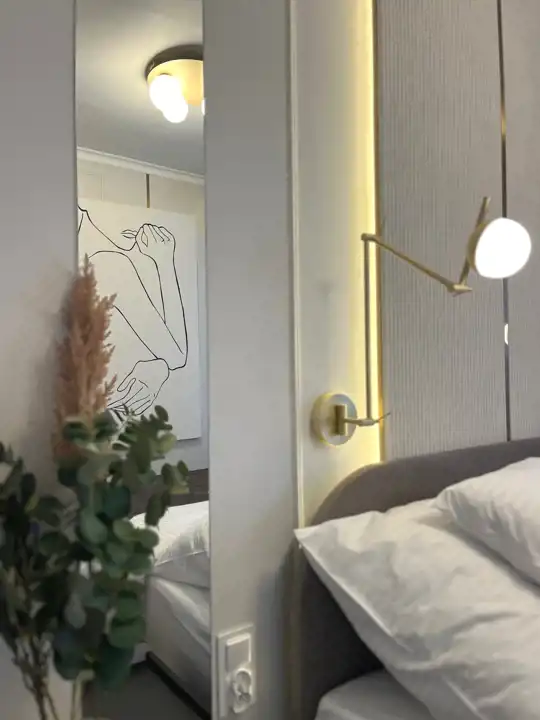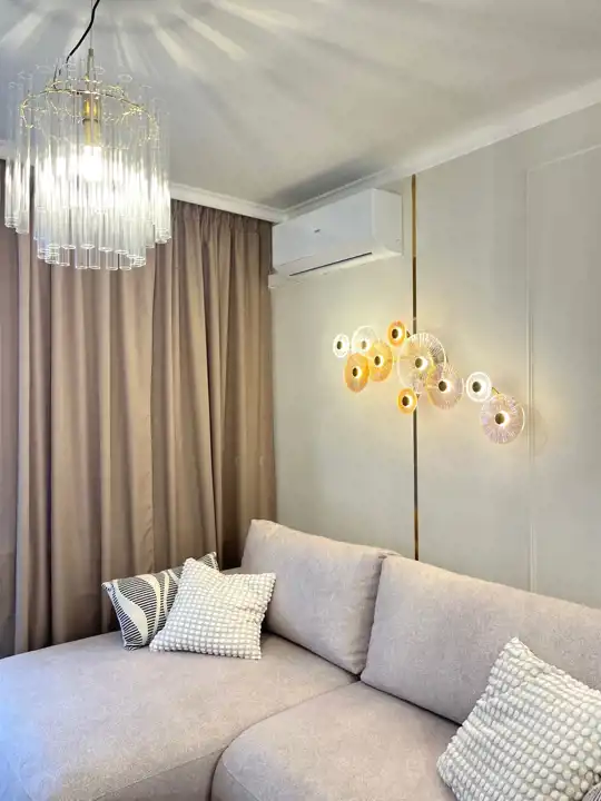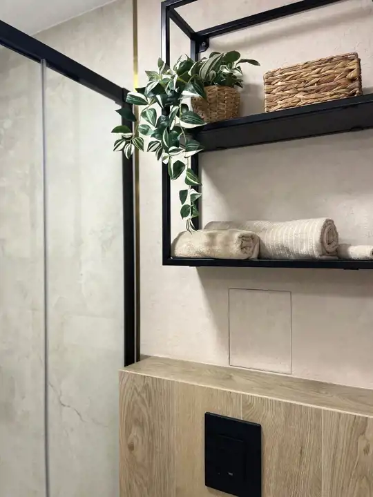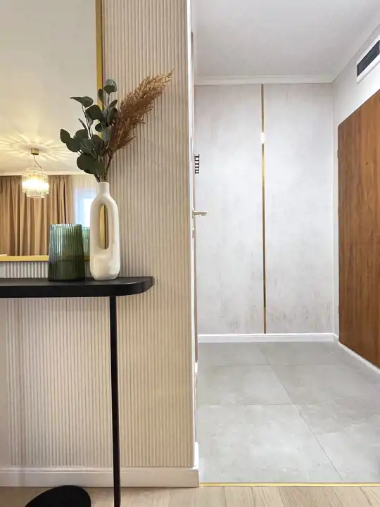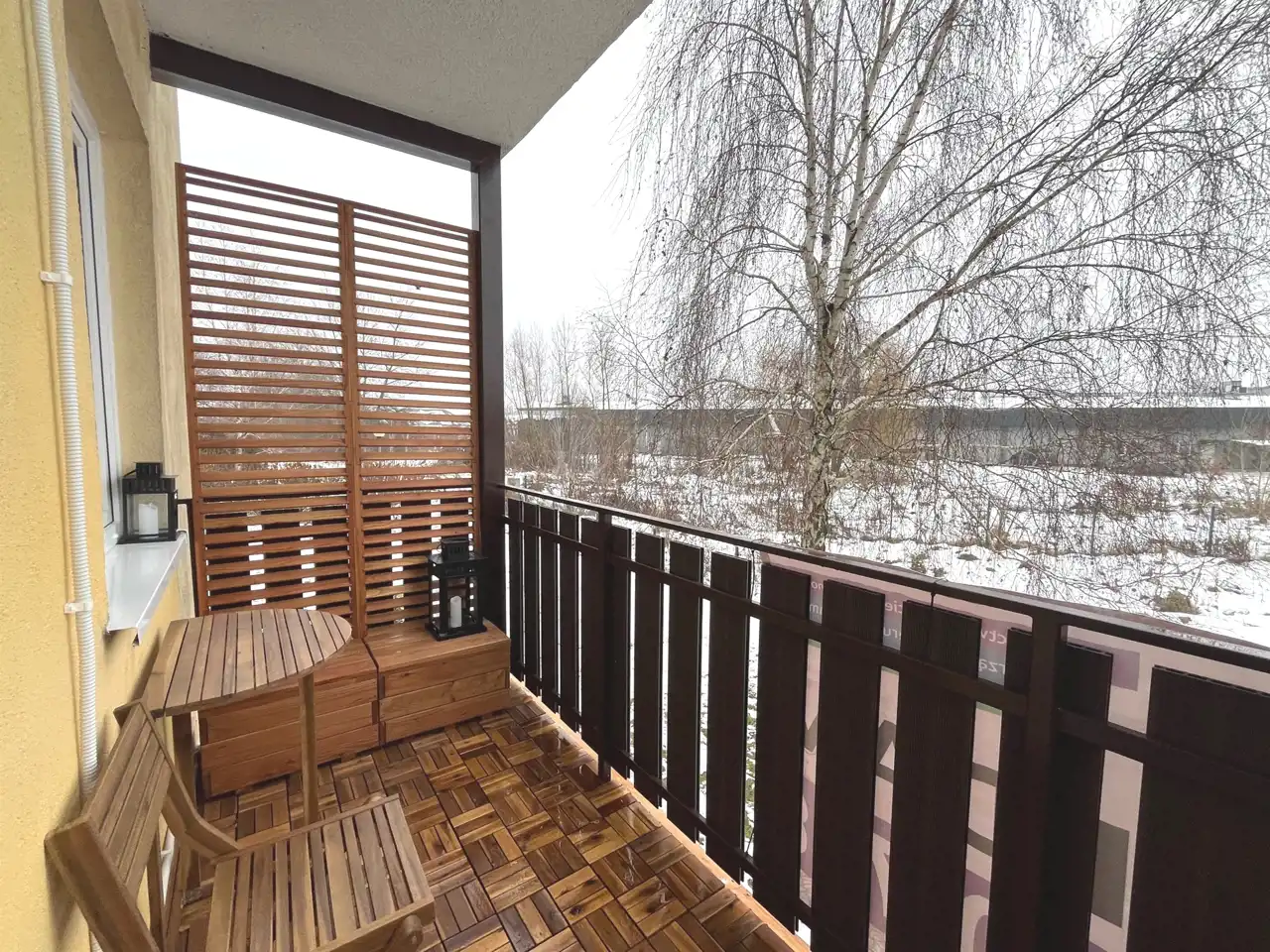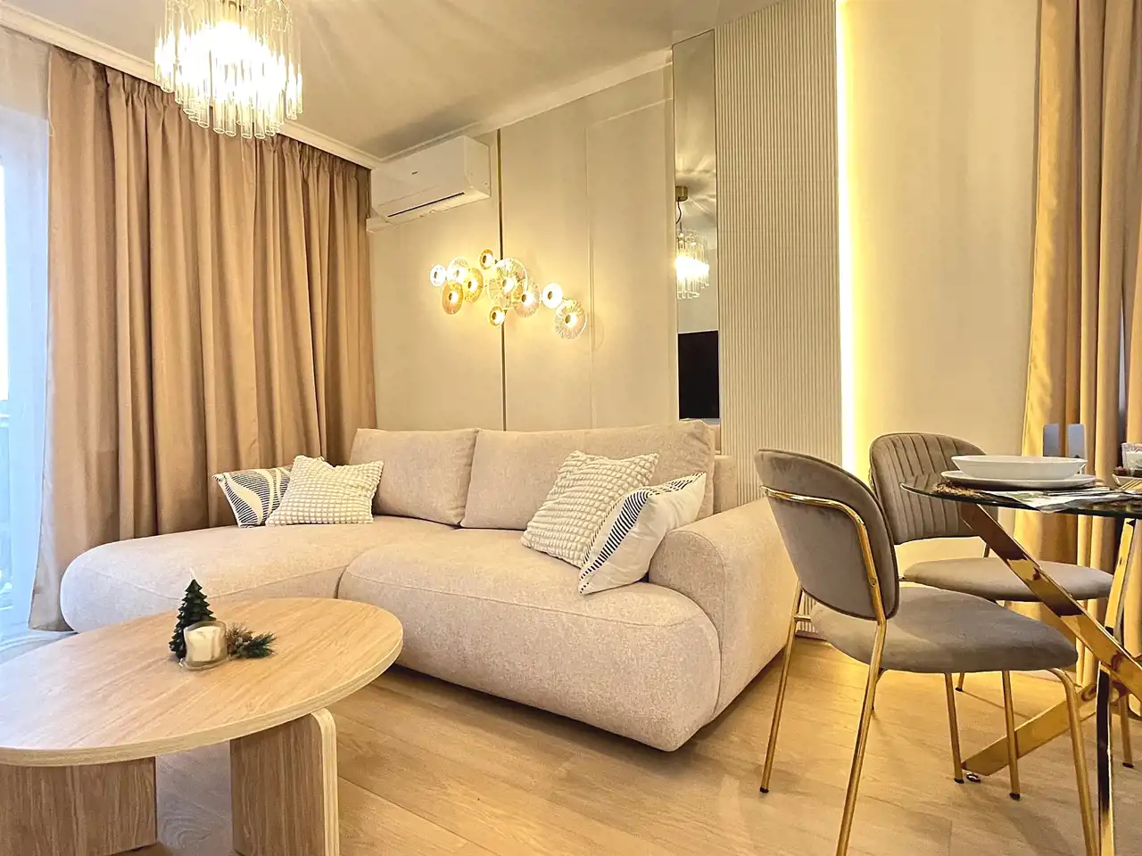 Jest świeżo wykończony, w pełni umeblowany i wyposażony w sprzęty RTV i AGD - telewizor, pralkosuszarkę, lodówkozamrażarkę, zmywarkę, piekarnik, płytę indukcyjną, okap kuchenny. Dodatkowo zainstalowano klimatyzację - zarówno z salonie jak i sypialni.