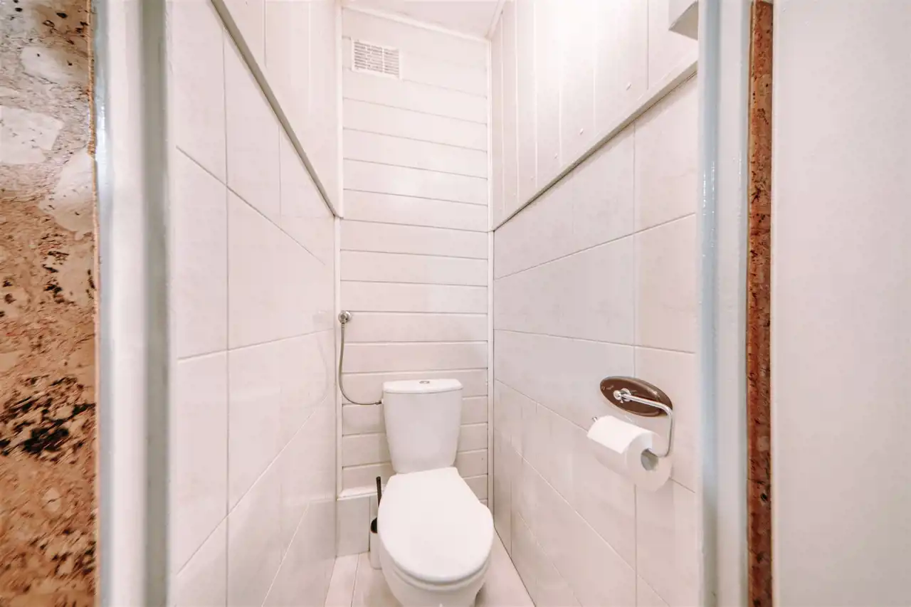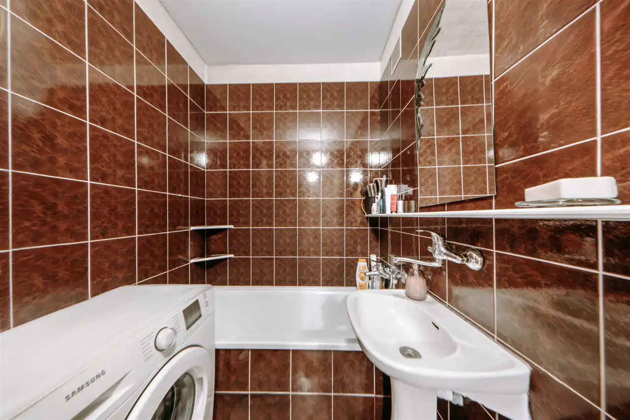 W łazience, kuchni i korytarzu na podłogach znajdują się kafle.
