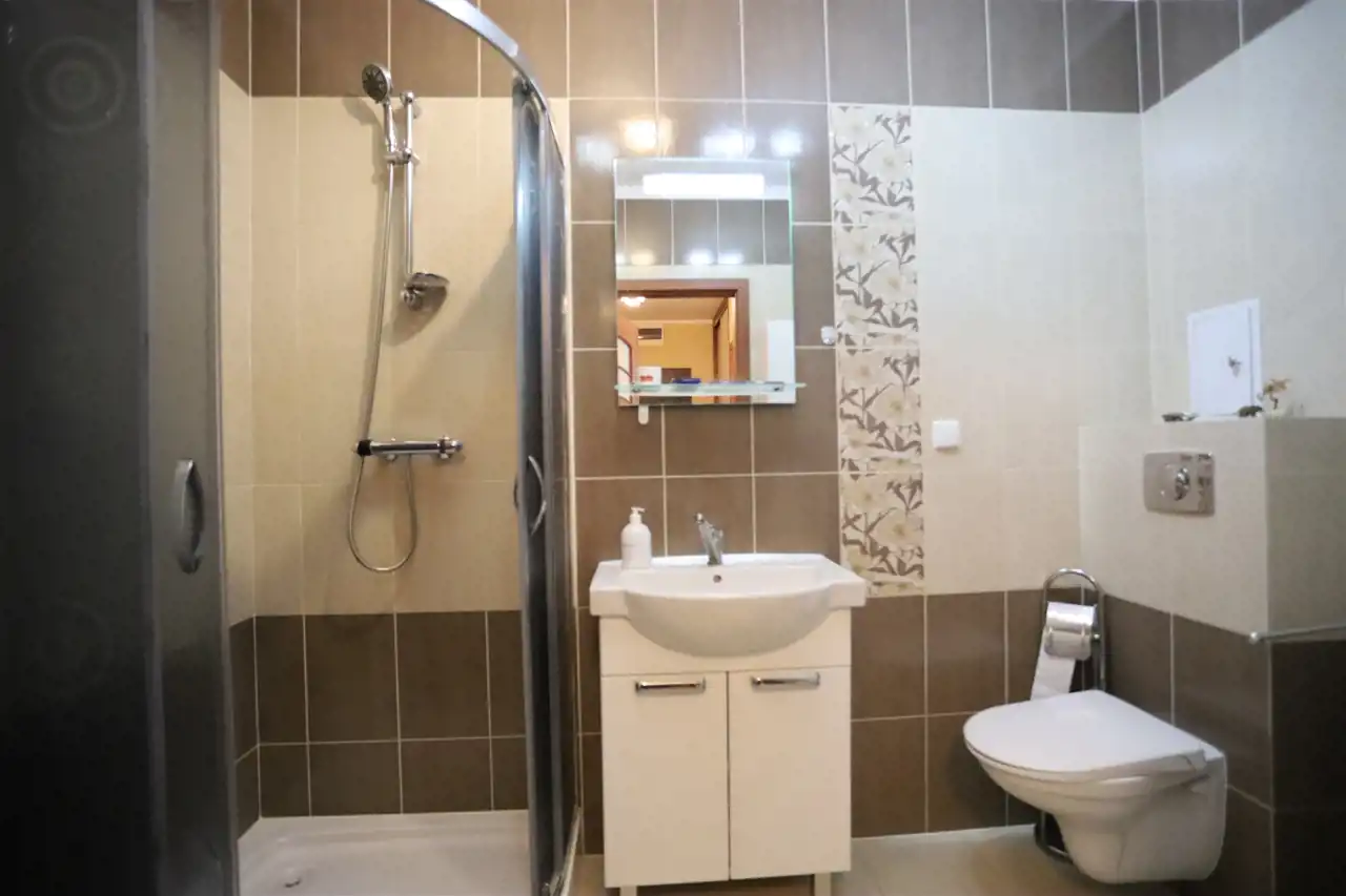 Lokal mieszkalny jest dwustronny i składa się z 2 pokoi (19/9m2), łazienki z wc i kabiną prysznicową (4,70m2), przedpokoju oraz przynależnej komórki lokatorskiej (3,20 m2).