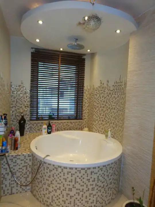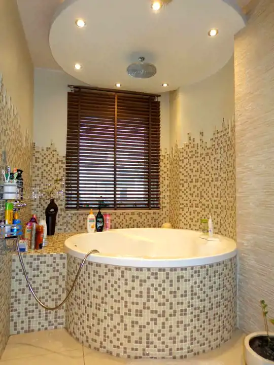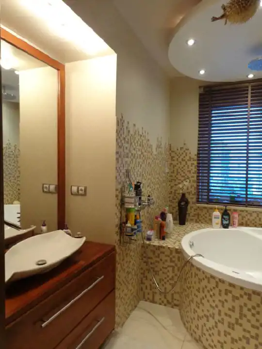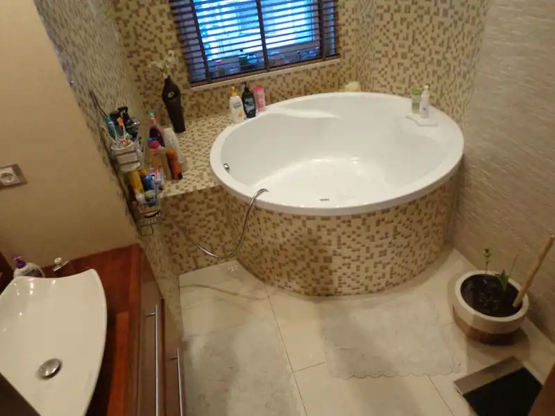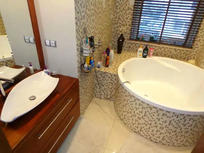 Łazienki wyłożone zostały szklaną mozaiką. Wyposażone są w wysokiej jakości biały montaż, m.in. wannę z deszczownicą.