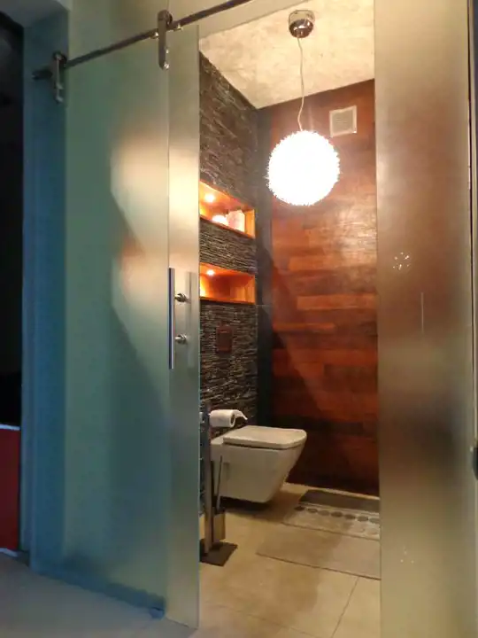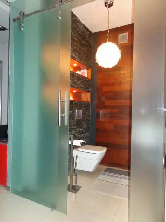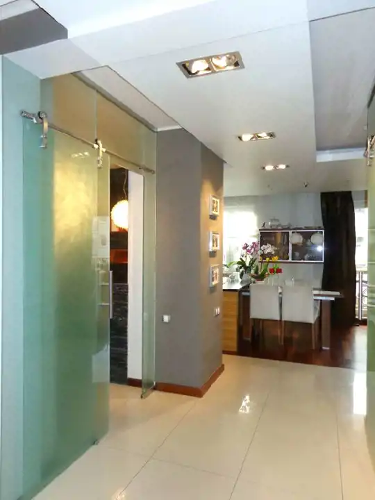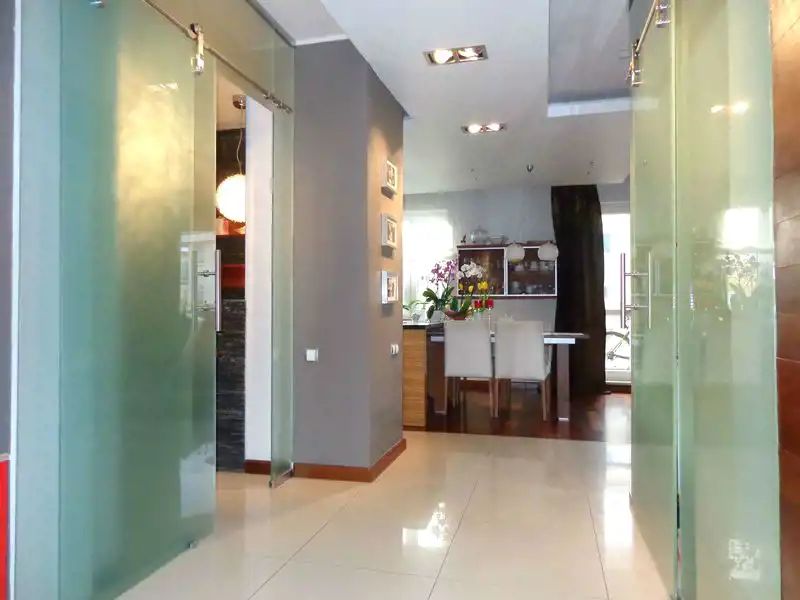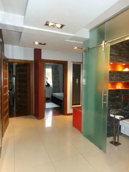 Oprócz wysokiej jakości materiałów, znajdziemy tu gustownie dobrane elementy wykończenia. Przeszklone przesuwne drzwi łazienkowe, podświetlane sufity.