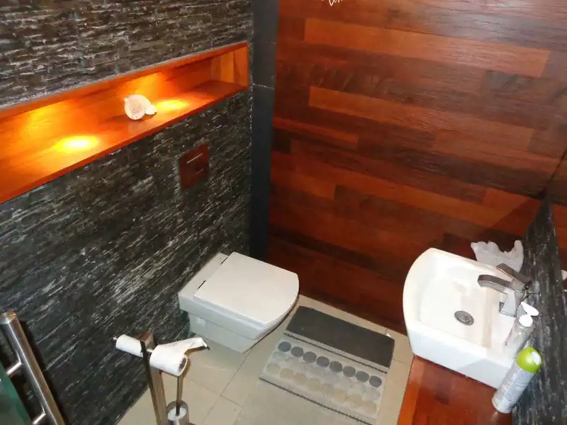 W pokojach położona jest egzotyczna podłoga Lapacho charakteryzująca się trwałością i odpornością na wodę. Na ścianach gładź oraz kamień naturalny.