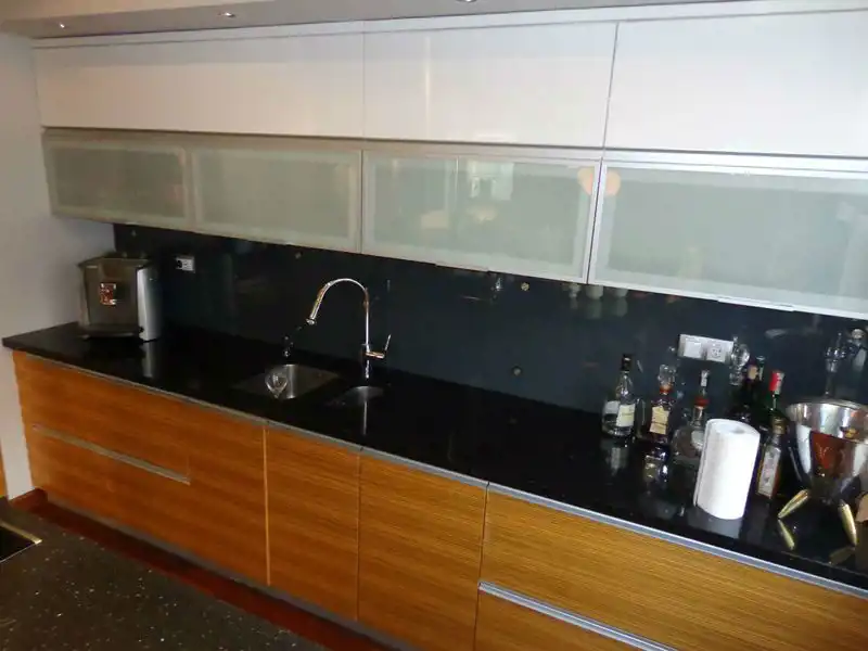 Kuchnia z granitowymi blatami, na ścianach również kamień naturalny.