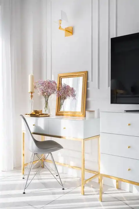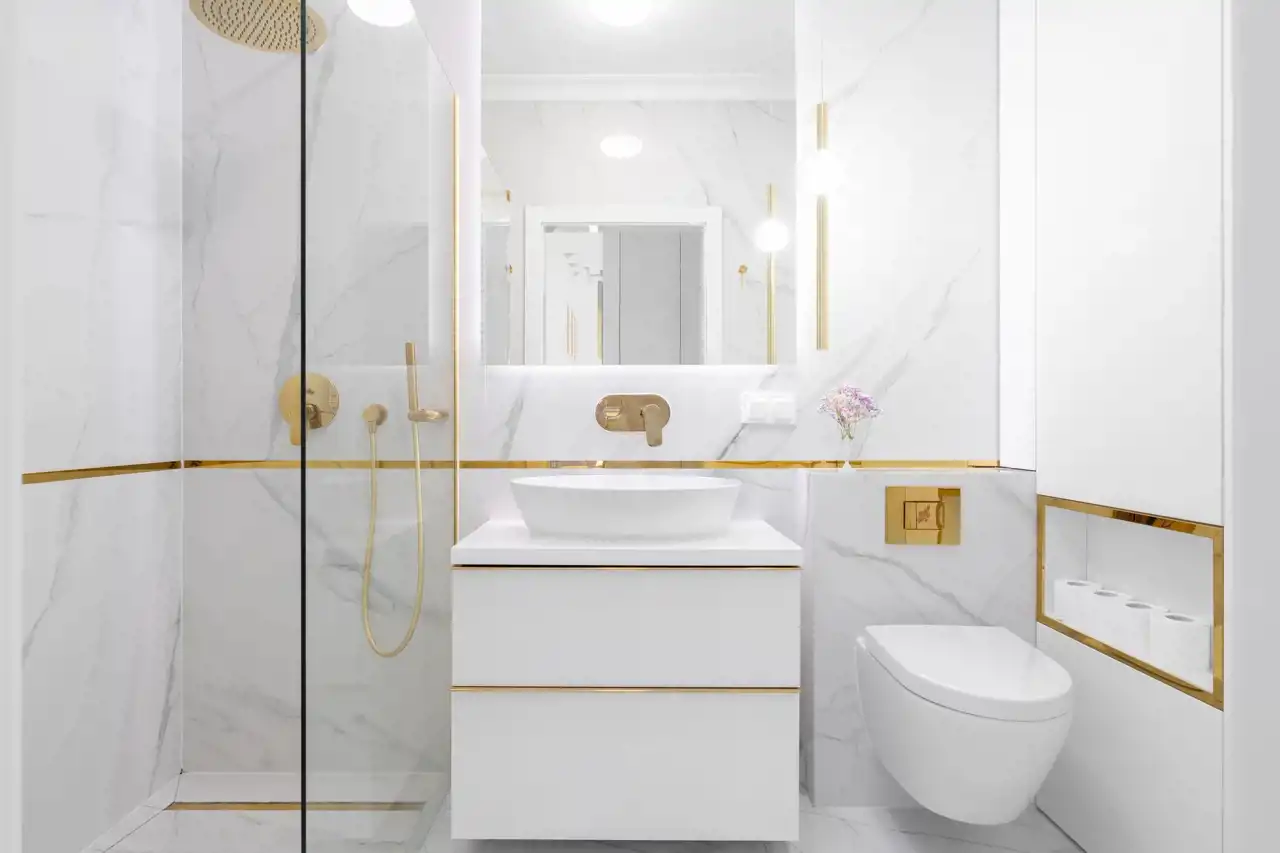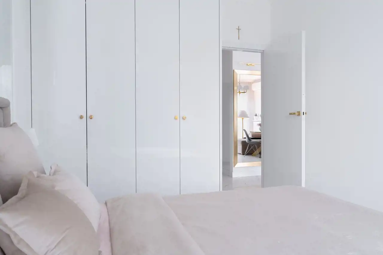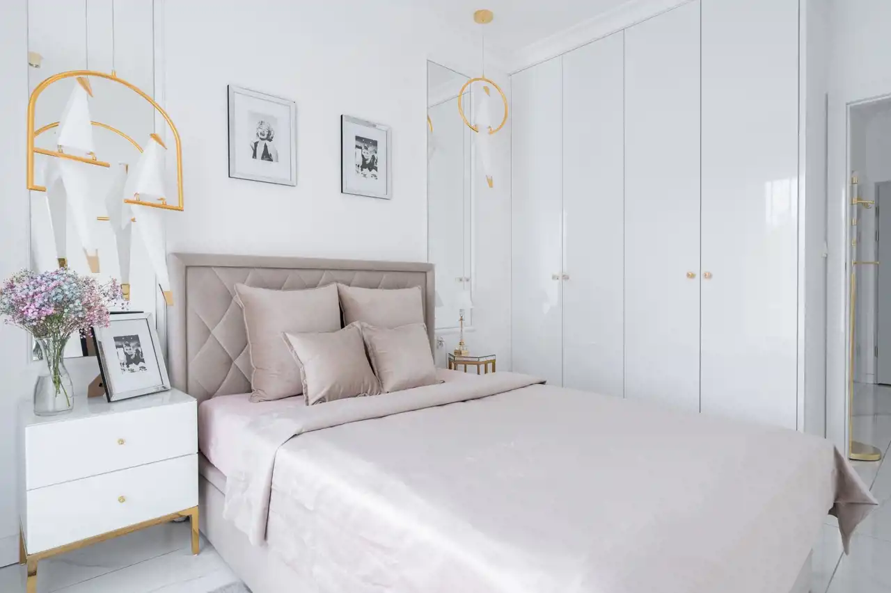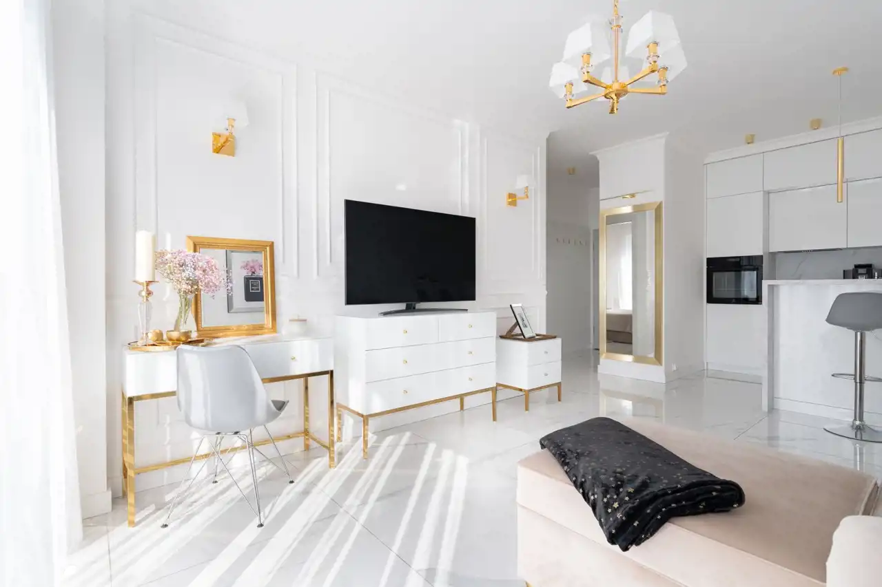 Mieszkanie zostało zaprojektowane z dbałością o każdy szczegół. Dominuje elegancka biało-złota stylistyka, a wszystkie elementy wyposażenia i wykończenia zostały wykonane z materiałów najwyższej klasy. Na całej powierzchni zastosowano wielkoformatowe płytki gresowe imitujące biały marmur, które nadają wnętrzom ekskluzywnego charakteru i wizualnie je powiększają.