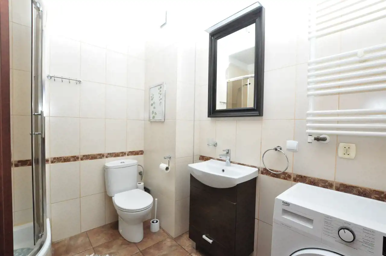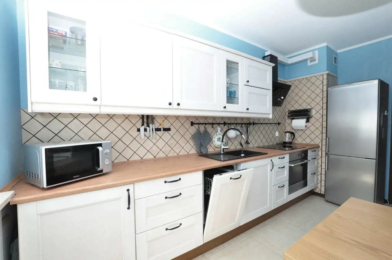 W wyposażeniu znajdują się m.in. pralka, duża lodówka z zamrażarką, czajnik oraz podstawowa zastawa kuchenna.