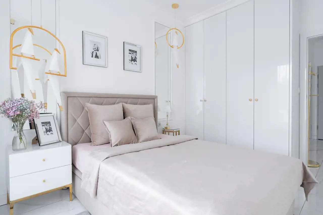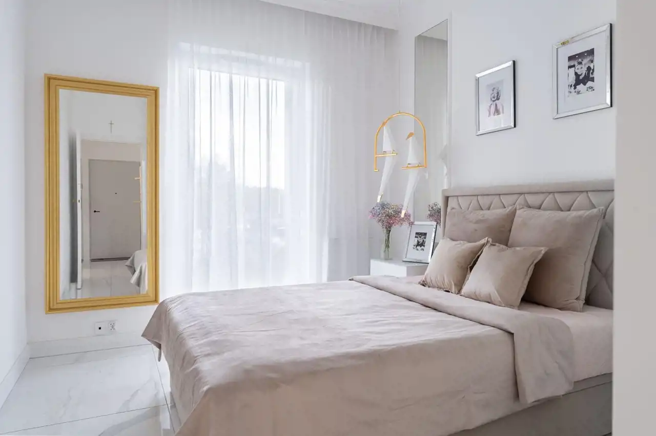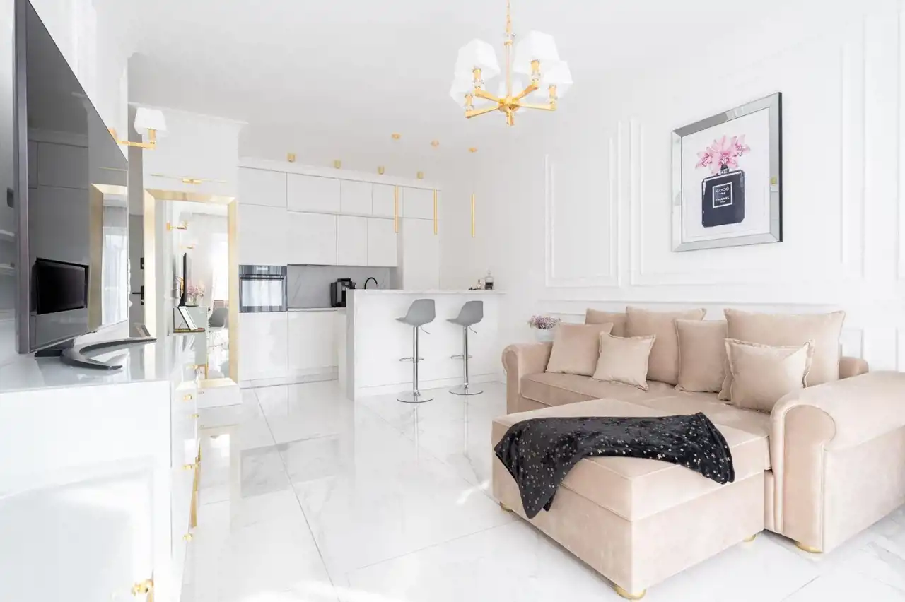 Mieszkanie charakteryzuje się wysokim standardem wykończenia, do którego użyto materiałów dobrej jakości oraz zadbano o każdy detal, zarówno o aspekt wizualny, jak i funkcjonalny. Zaprojektowane wnętrze zostało przemyślane, aby maksymalnie zagospodarować dostępny metraż, co pozwoliło na stworzenie przestronnej i przytulnej strefy komfortu. Mieszkanie jest utrzymane w stonowanej kolorystyce bieli, beżu, grafitu z elementami złota, co nadaje mu elegancji i sprawia, że pomieszczenia współgrają ze sobą. Dzięki niebanalnemu wykończeniu i wyposażeniu wnętrze ma klimat, w którym chce się przebywać i do którego z przyjemnością się wraca.