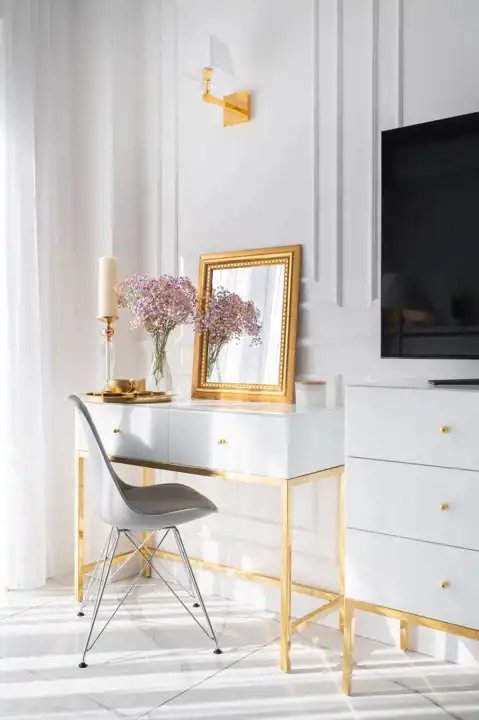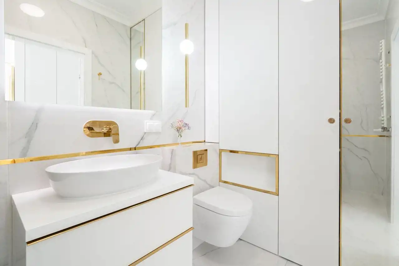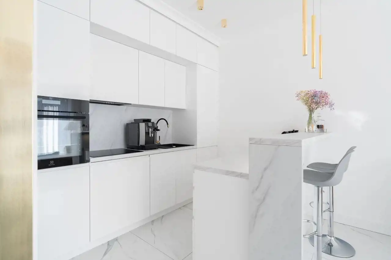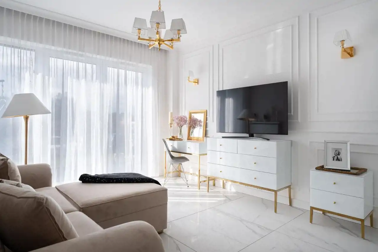 Mieszkanie charakteryzuje się wysokim standardem wykończenia, do którego użyto materiałów dobrej jakości oraz zadbano o każdy detal, zarówno o aspekt wizualny, jak i funkcjonalny. Zaprojektowane wnętrze zostało przemyślane, aby maksymalnie zagospodarować dostępny metraż, co pozwoliło na stworzenie przestronnej i przytulnej strefy komfortu. Mieszkanie jest utrzymane w stonowanej kolorystyce bieli, beżu, grafitu z elementami złota, co nadaje mu elegancji i sprawia, że pomieszczenia współgrają ze sobą. Dzięki niebanalnemu wykończeniu i wyposażeniu wnętrze ma klimat, w którym chce się przebywać i do którego z przyjemnością się wraca.