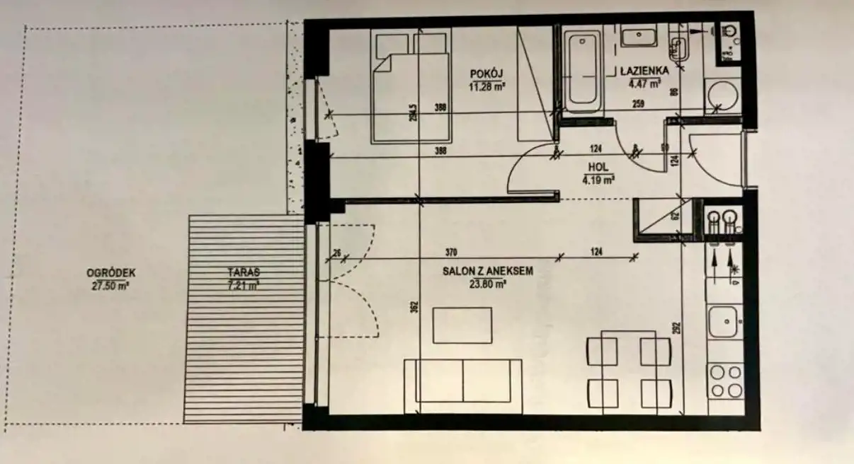 - salonu z wyjściem na ogródek 27,5 m2 połączonego z aneksem kuchennym,