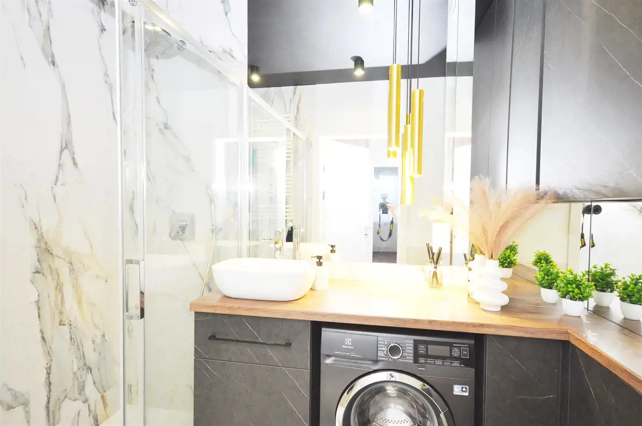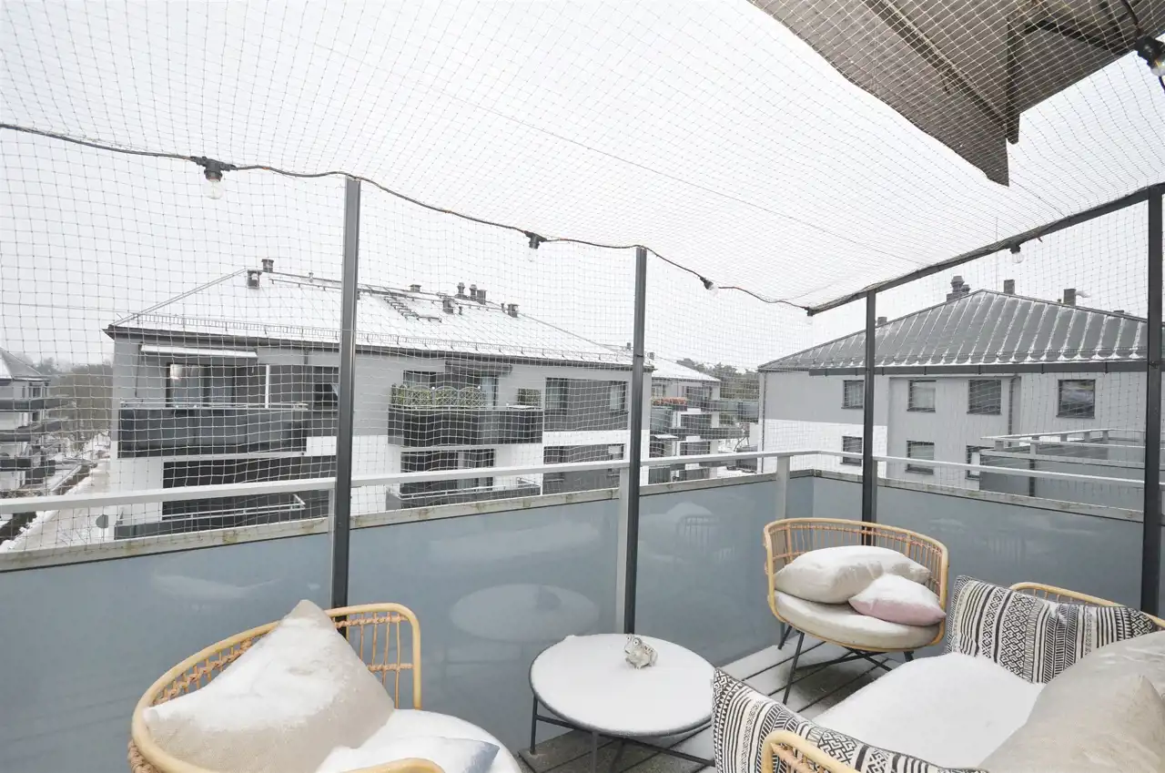 Punktem centralnym mieszkania jest przestrony salon z aneksem kuchennym oraz wyjściem na balkon – idealne miejsce na poranną kawę, letni odpoczynek czy kameralne spotkania z bliskimi. To prawdziwe przedłużenie salonu, które latem staje się miejscem do odpoczynku przy lampce wina.