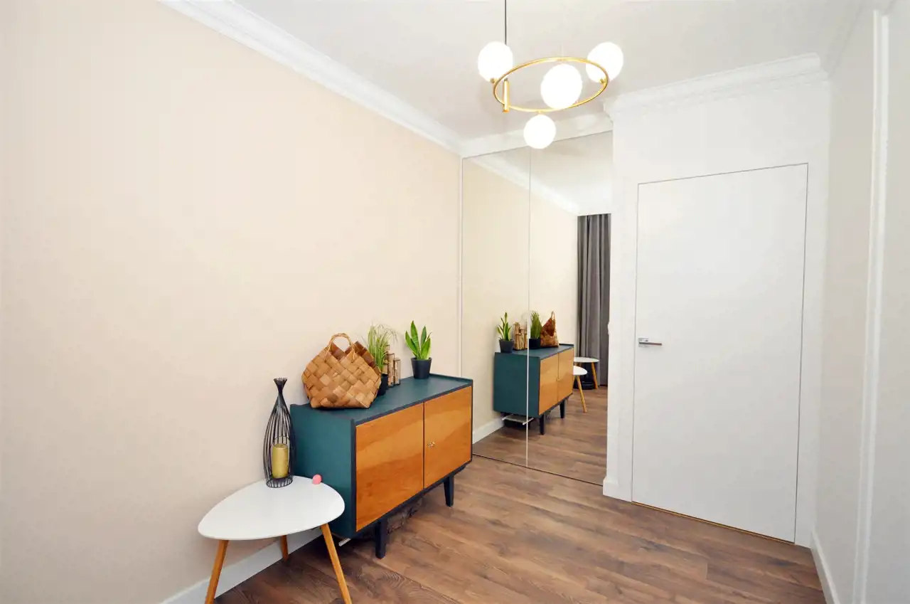 przestronny przedpokój z miejscem do przechowywania (2 szafy w zabudowie, robione przez stolarza)