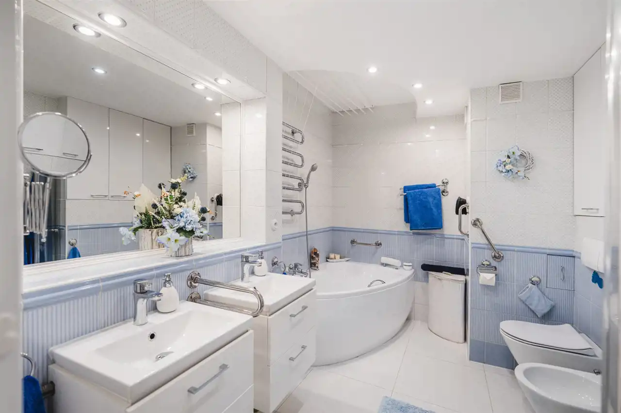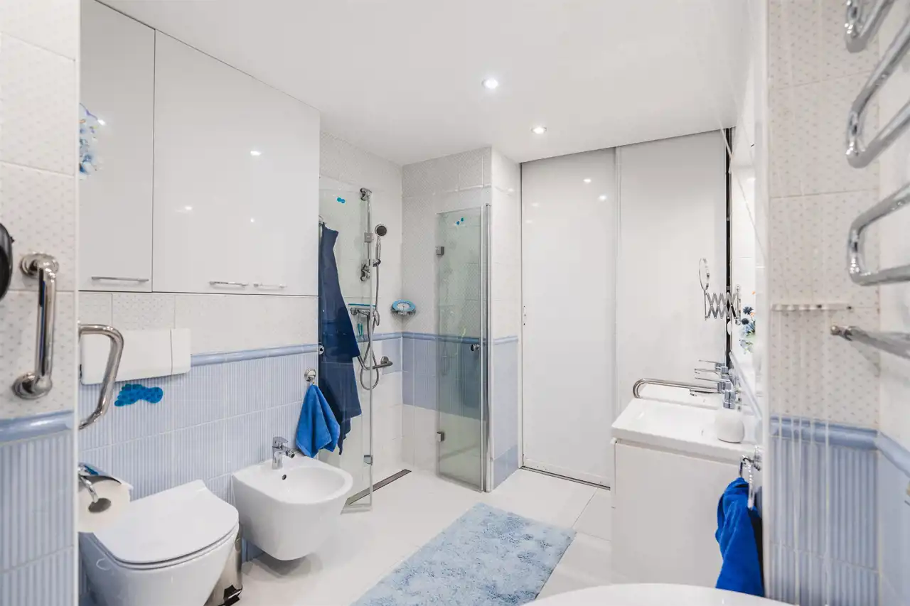 Mieszkanie o nietypowym układzie, na całośc skałdają się: duża kuchnia z jadalnią, salon z wyjściem na balkon, sypialnia z szafą w zabudowie, pokój który teraz pałni funkcję gabinetu oraz duża bo prawie 7 m łazienka w której znalazło sie miejsce na prysznic, wannę, bidet i dwie umywalki.