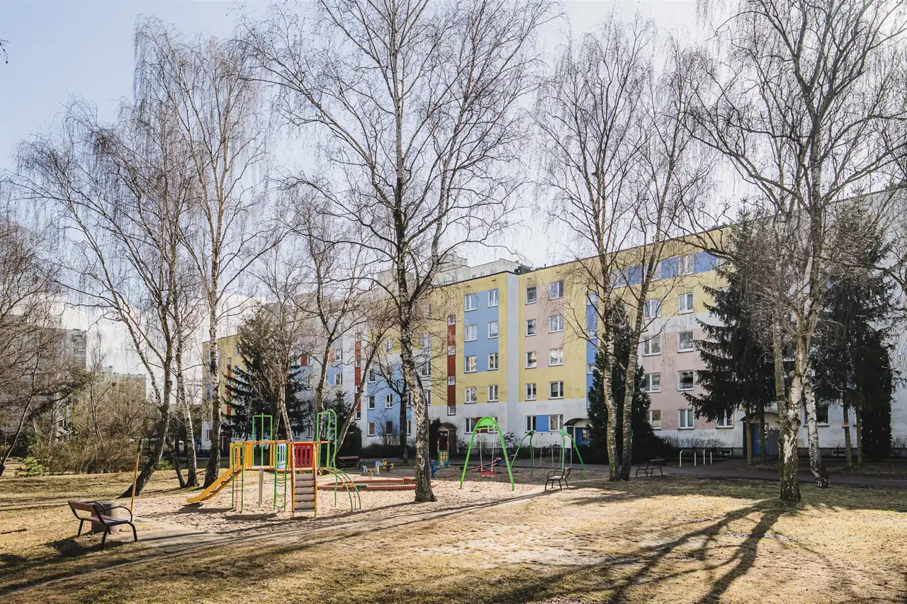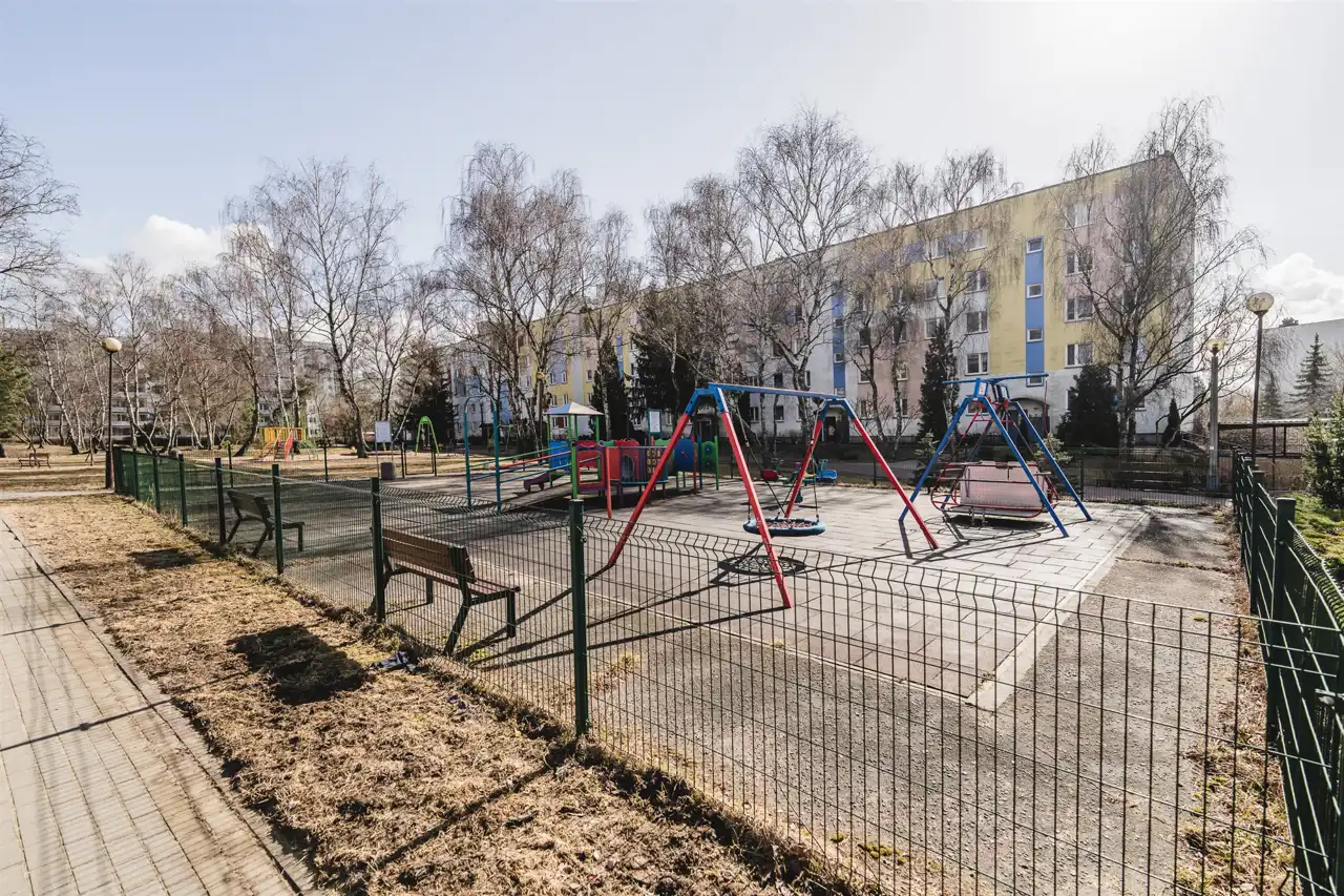 Budynek znajduje się w otoczeniu zieleni, tuz przed blokiem znajduje sie duży plac zabaw.