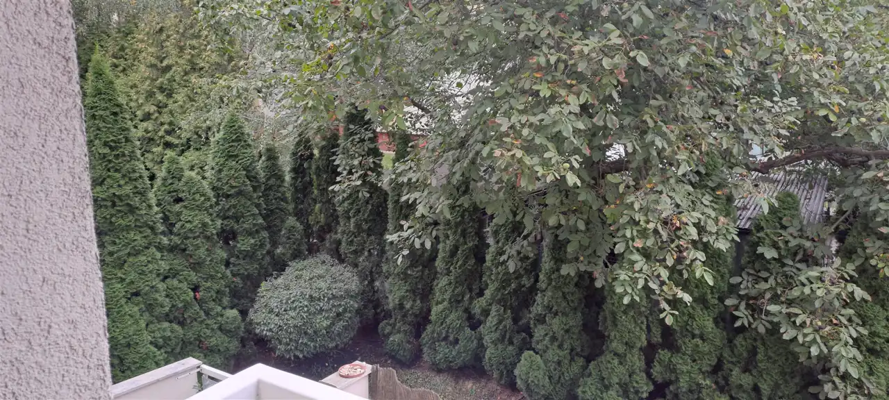 -z dużego salonu, z którego wychodzi się na obszerny balkon, przestrzeń do wypoczynku z ładnym widokiem na okoliczną zieleń,