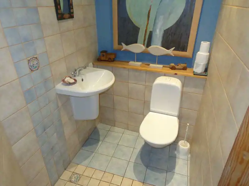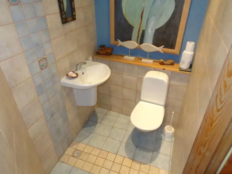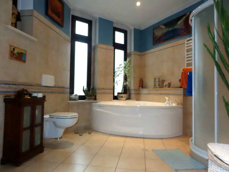 W łazience i WC nowoczesna glazura i terakota. Łazienka posiada kilka okien. Jest bardzo gustownie zaaranżowana.