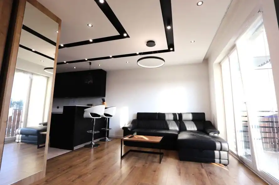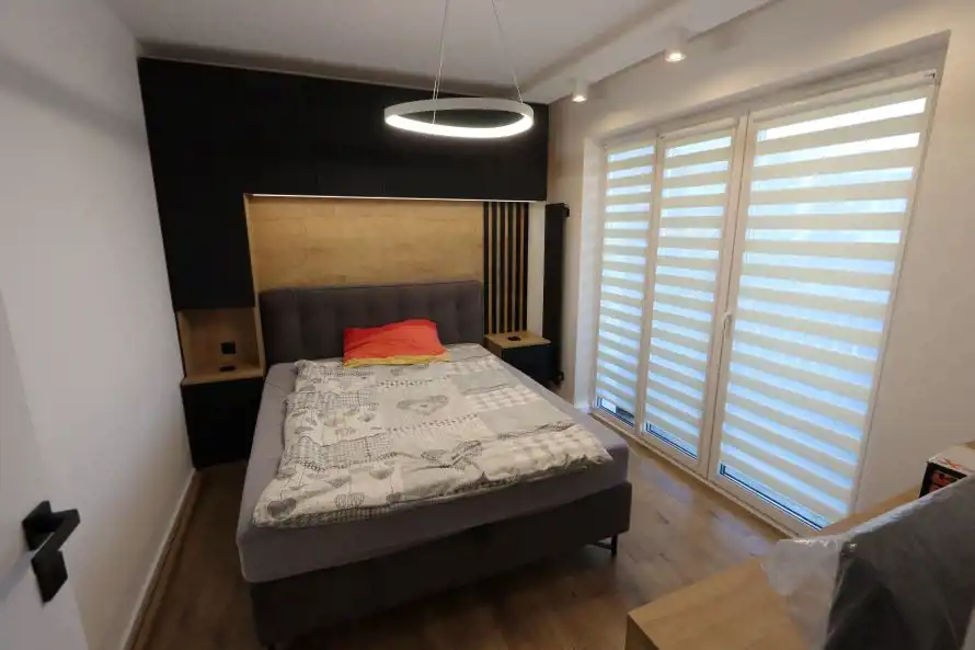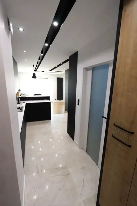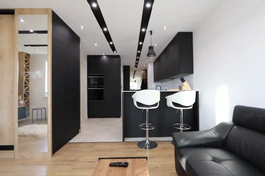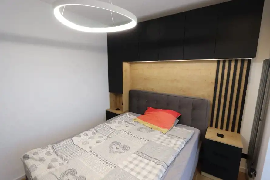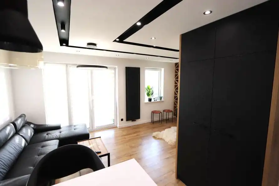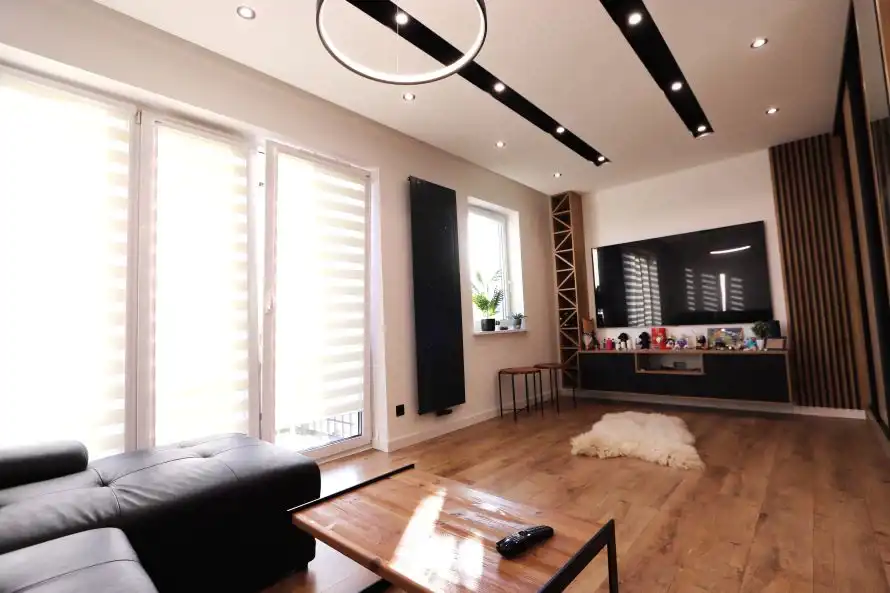 Na szczególną uwagę zasługuje aranżacja wnętrza w nowoczesnym stylu oraz wykorzystanie przestrzeni z dużą ilością zabudowy meblowej.