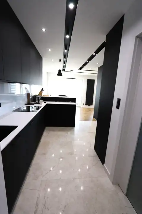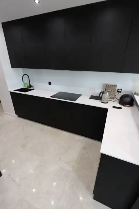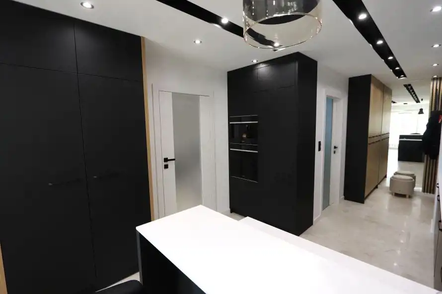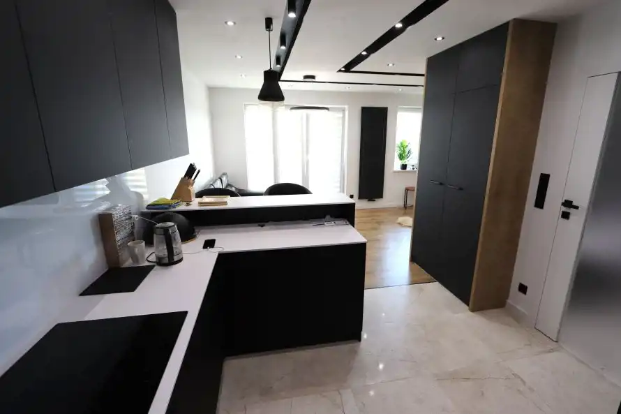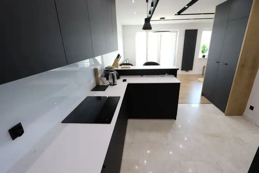 Wysokiej jakości zabudowa kuchenna z meblami , sprzęt AGD w zabudowie (lodówka, zmywarka, ekspres do kawy płyta indukcyjna ,piekarnik elektryczny).