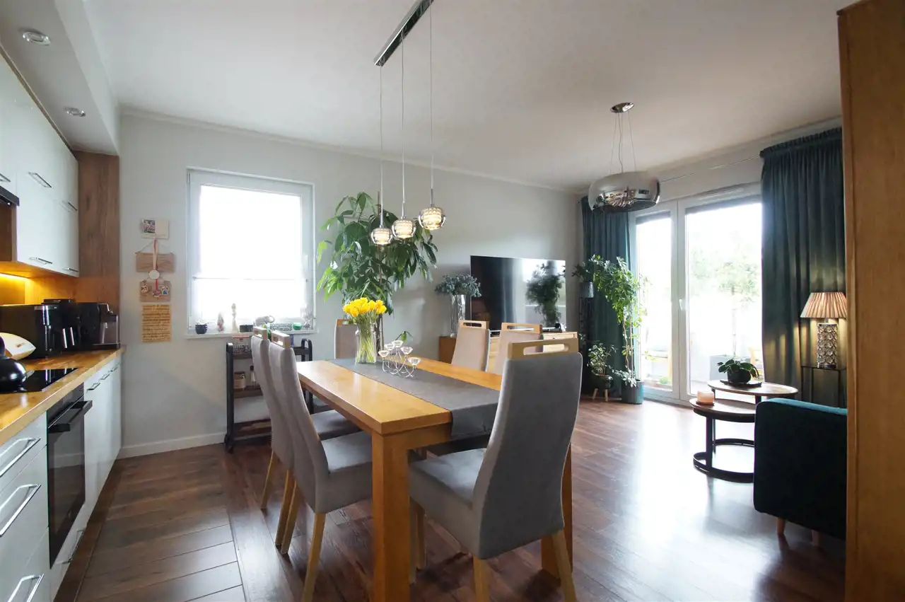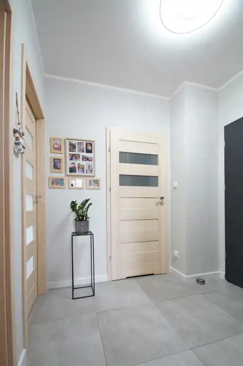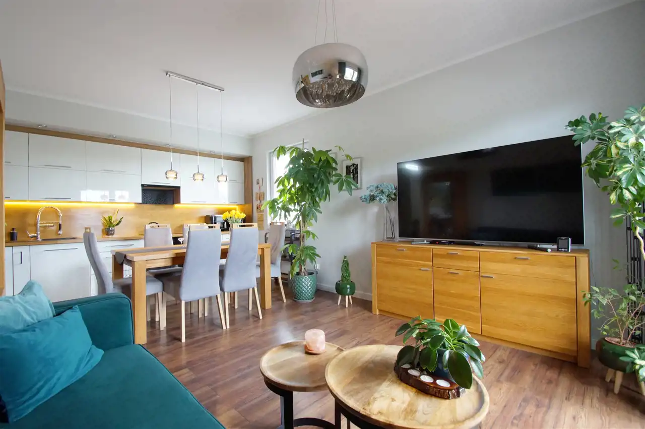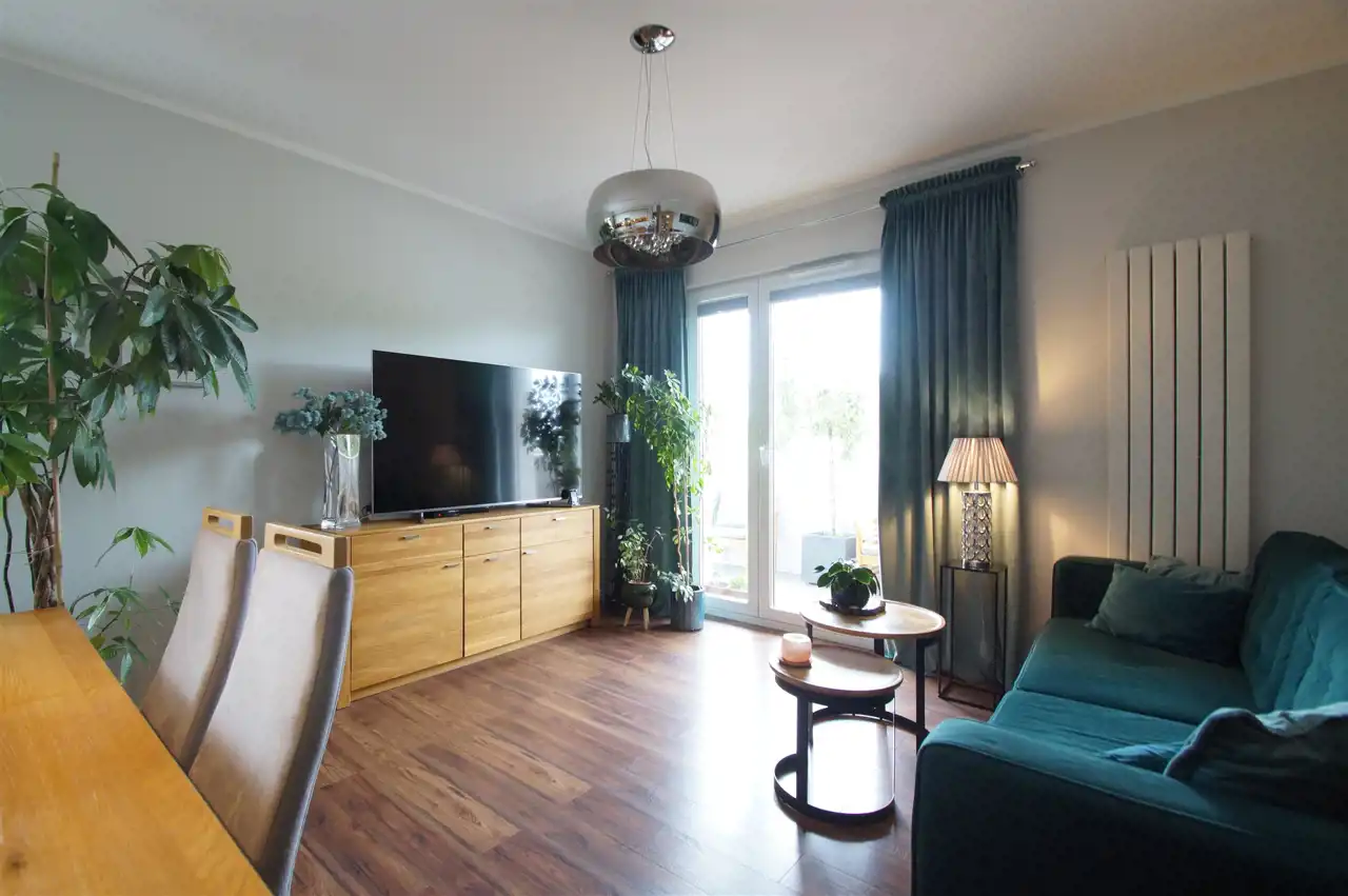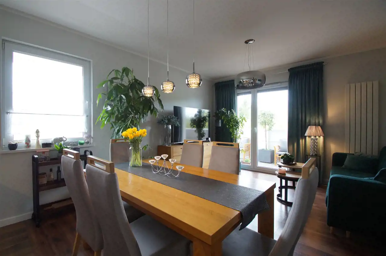 Mieszkanie jest gustownie urządzone, nie wymaga dodatkowego doinwestowania. Pozostaje wyposażone w stałe zabudowy i sprzęt AGD (chłodziarko- zamrażarka, zmywarka, płyta indukcyjna, okap, piekarnik, videodomofon), czyste, zadbane, na ścianach gładzie. Odświeżone w ostatnim kwartale 2024roku. Na ścianach zmywalne, silikonowe farby. Wszystkie meble zostały zaprojektowane i wykonane na zamówienie u wiodącego polskiego producenta. Blaty dębowe olejowane w kuchni i łazience. W łazience położono włoskie płytki, na podłodze izolacja przeciwwilgociowa. W każdym pokoju aktywny sygnał antenowy. Z salonu wyjście na duży (17 m2) samodzielny, osłonięty taras, w przedpokoju videodomofon i duża szafa w zabudowie.