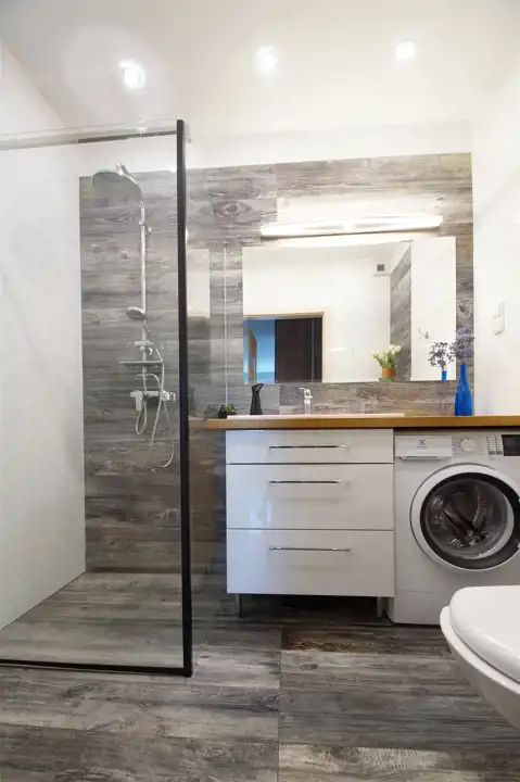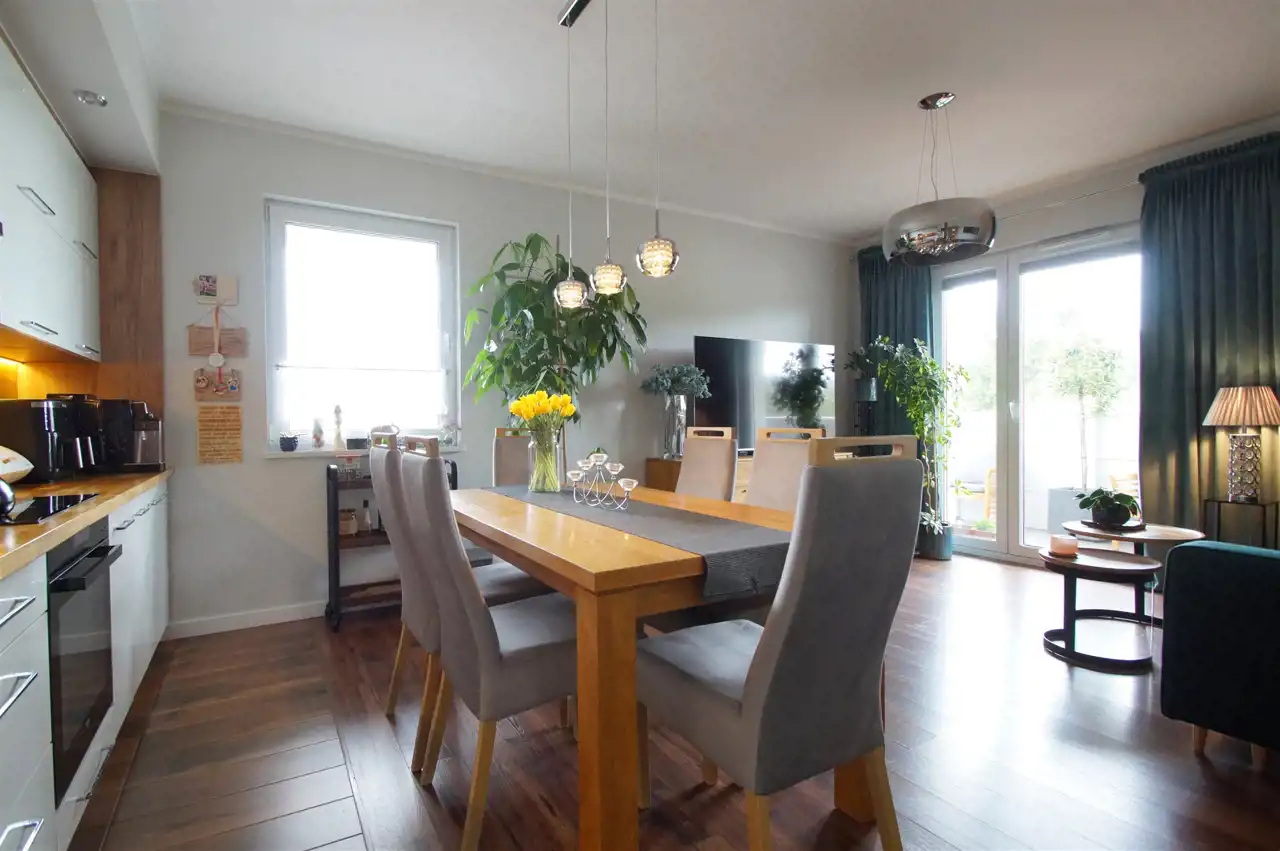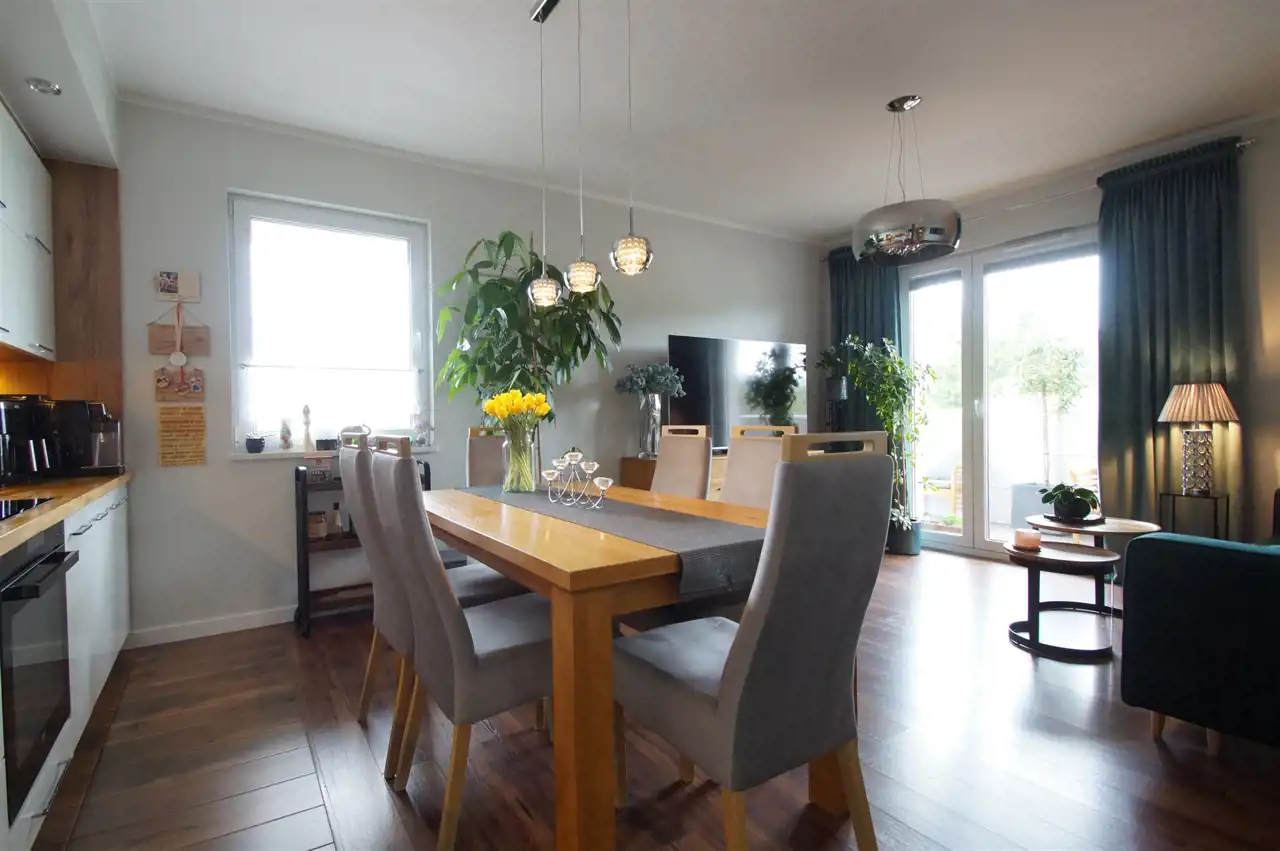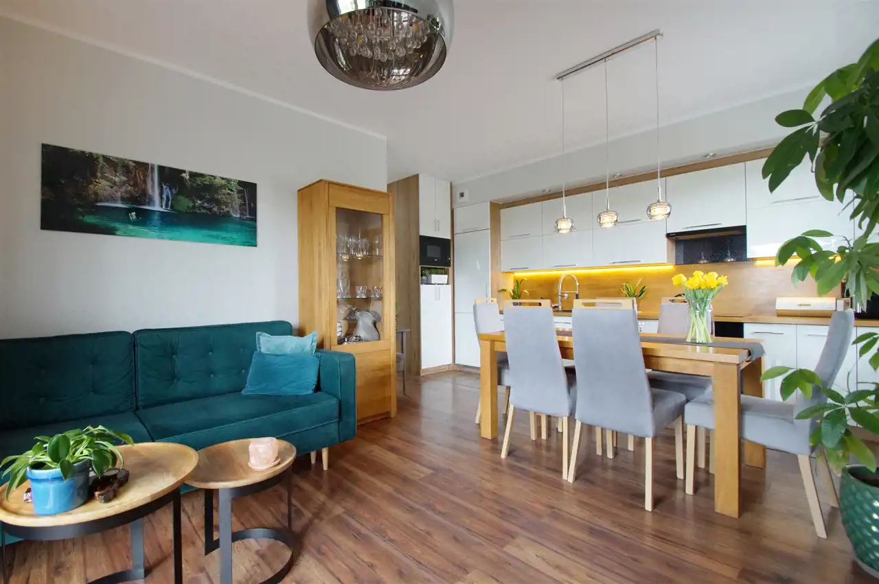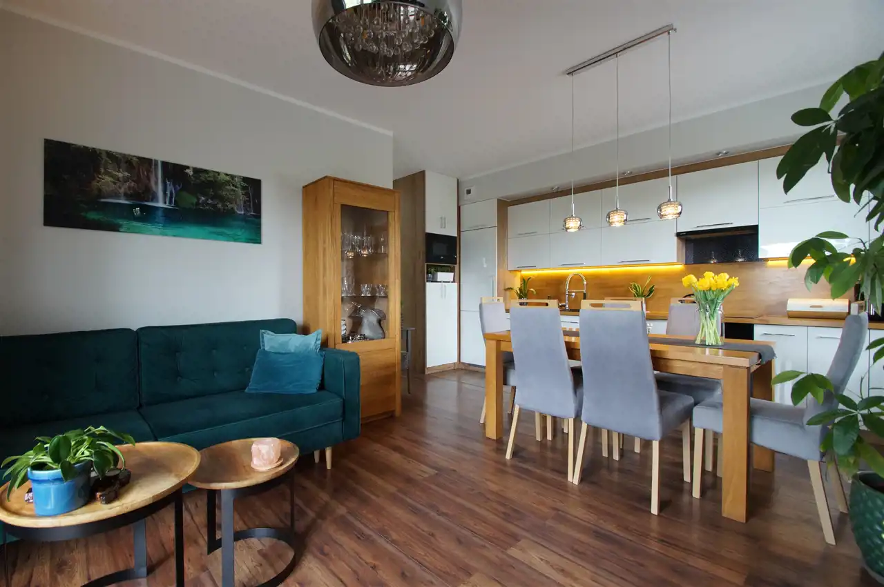 Mieszkanie jest gustownie urządzone, nie wymaga dodatkowego doinwestowania. Pozostaje wyposażone w stałe zabudowy i sprzęt AGD (chłodziarko- zamrażarka, zmywarka, płyta indukcyjna, okap, piekarnik, videodomofon), czyste, zadbane, na ścianach gładzie. Odświeżone w ostatnim kwartale 2024roku. Na ścianach zmywalne, silikonowe farby. Wszystkie meble zostały zaprojektowane i wykonane na zamówienie u wiodącego polskiego producenta. Blaty dębowe olejowane w kuchni i łazience. W łazience położono włoskie płytki, na podłodze izolacja przeciwwilgociowa. W każdym pokoju aktywny sygnał antenowy. Z salonu wyjście na duży (17 m2) samodzielny, osłonięty taras, w przedpokoju videodomofon i duża szafa w zabudowie.
