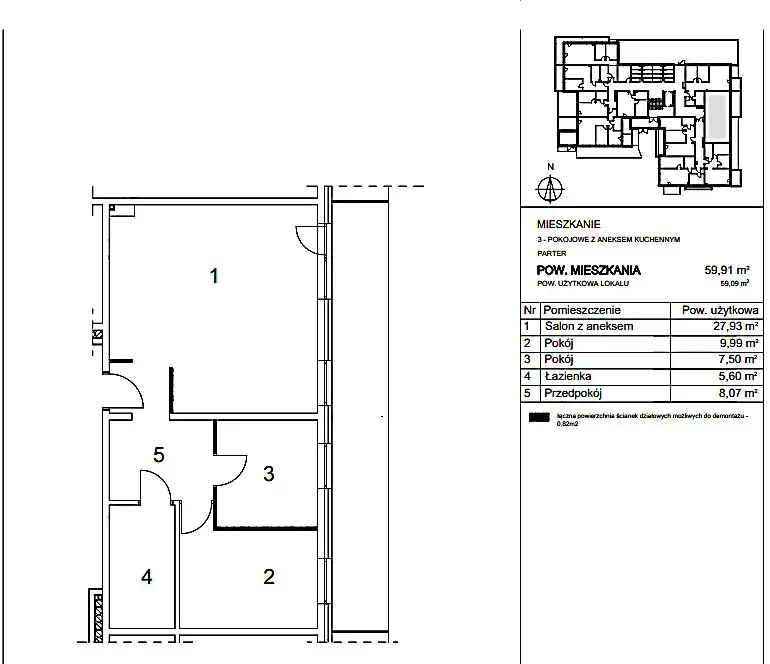 Mieszkanie o powierzchni 59,09 m² składa się z: