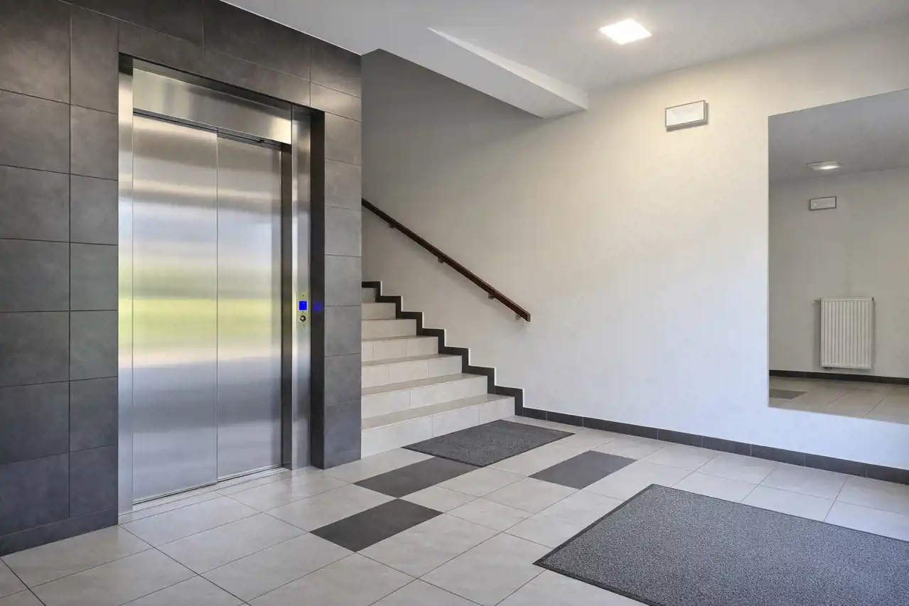 Kameralny blok, nowocześnie zaprojektowana, jasna klatka schodowa, schody niskie, winda z poziomu -1.
